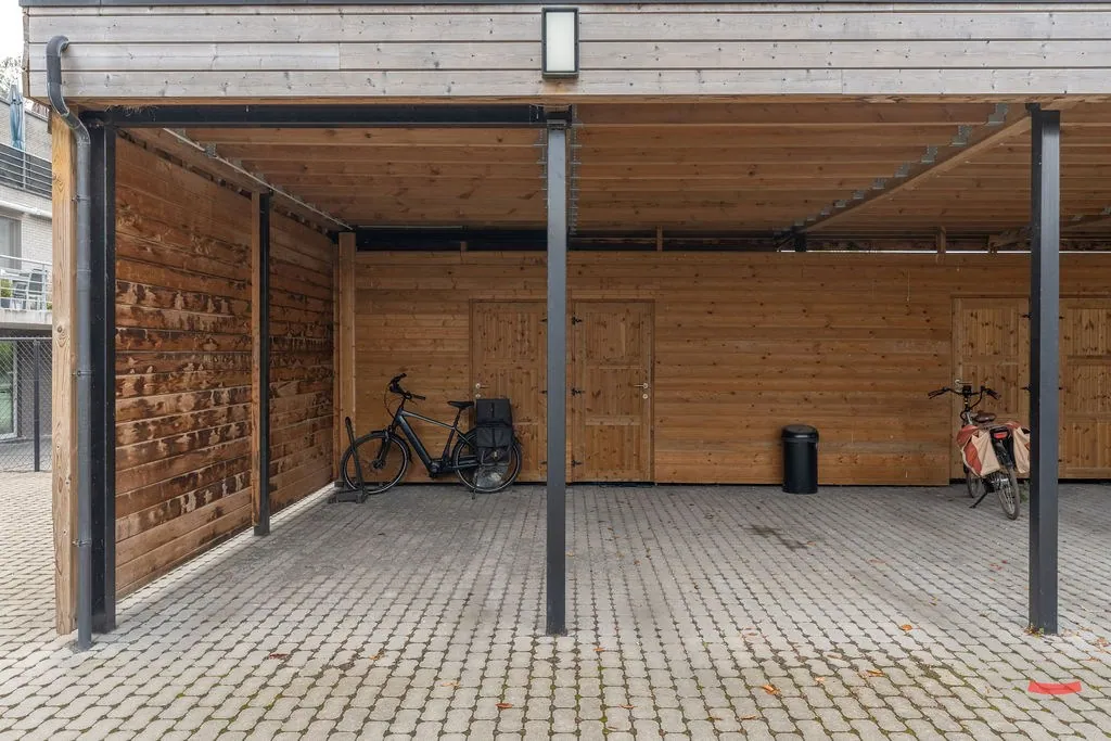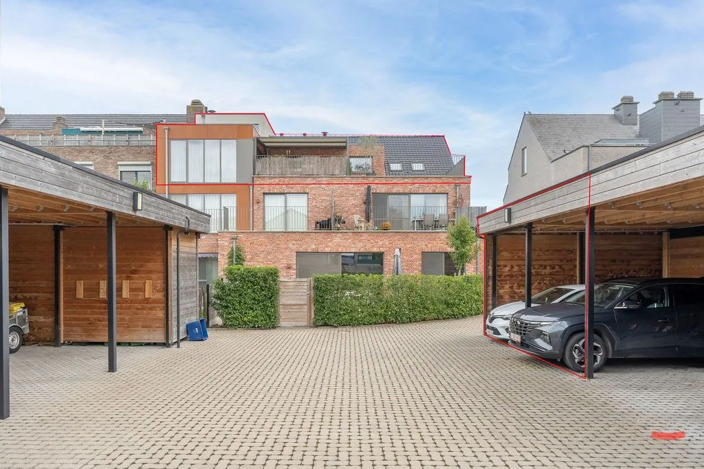 Achter het gebouw heb je 2 carports, ook telkens met nog een kleine bergplaats.