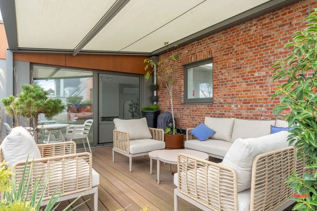 De woonkamer geeft ook toegang naar het grote terras. We laten de foto’s voor zichzelf spreken, want wat een feestje. Sfeervol, groen en tot in de puntjes in orde. Er is een automatische luifel/overkapping aanwezig, dus ook in hoogzomer is ’t hier heerlijk vertoeven.