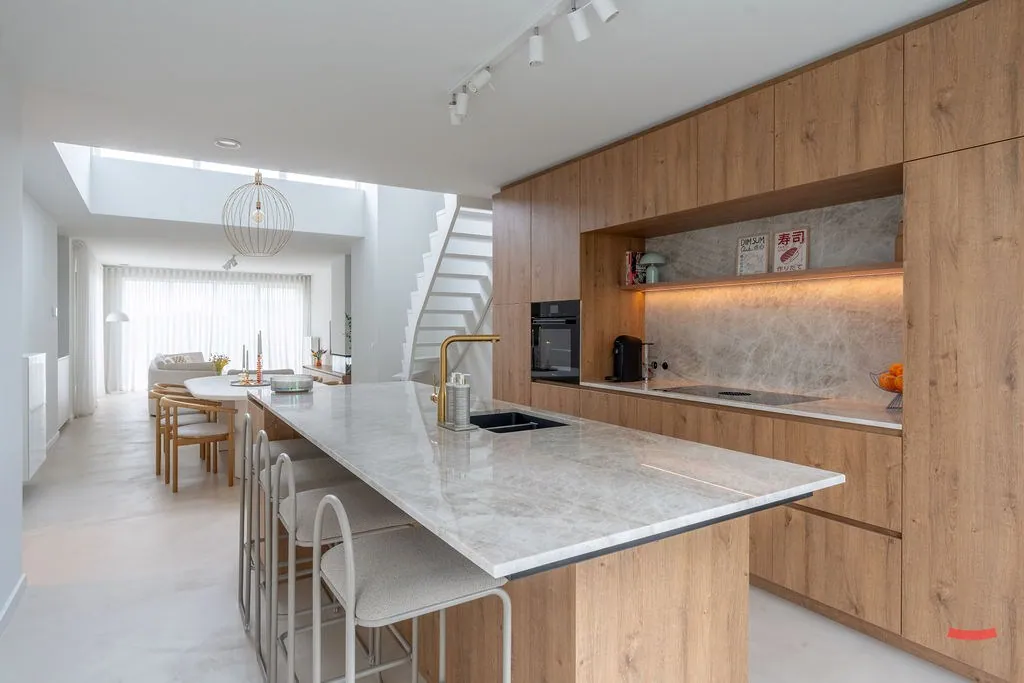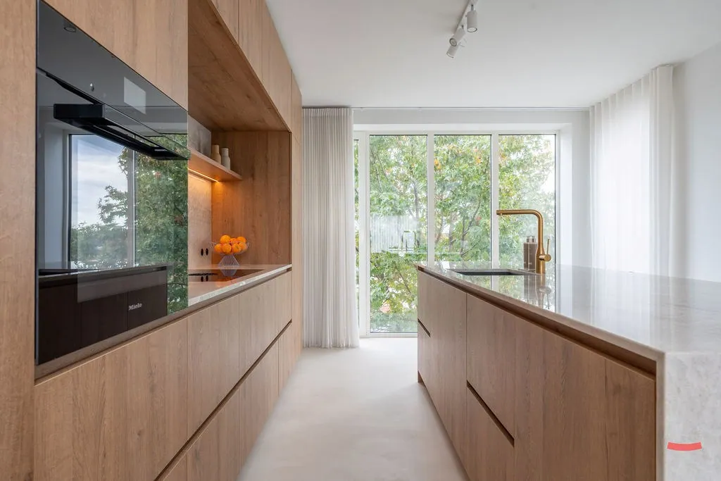 Zullen we links beginnen, en door de (prachtige) stalen deur wandelen? Want da’s meteen een absolute binnenkopper: een waanzinnige woonkamer met open keuken. Let effe op, want je weet niet wat je ziet: plafonds van 6m hoog, mégaveel lichtinval, een speelse indeling met hoogwaardige materialen, een cosy haard met kastenwand, een strakke, warme vloer in microtopping, een airco voor tijdens de zwoele zomerdagen, en en en…een keuken “uit de boekskes”. Alle snufjes zijn aanwezig – hoe kan het ook anders – en dat alles in een stijlvol, maar gebruiksvriendelijk jasje. Heb je trouwens ook dat grote raam met zicht op ’t groen gespot? Jawel, je zou bijna vergeten dat je aan de Grote Baan woont.