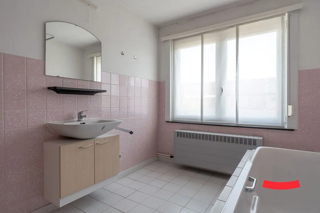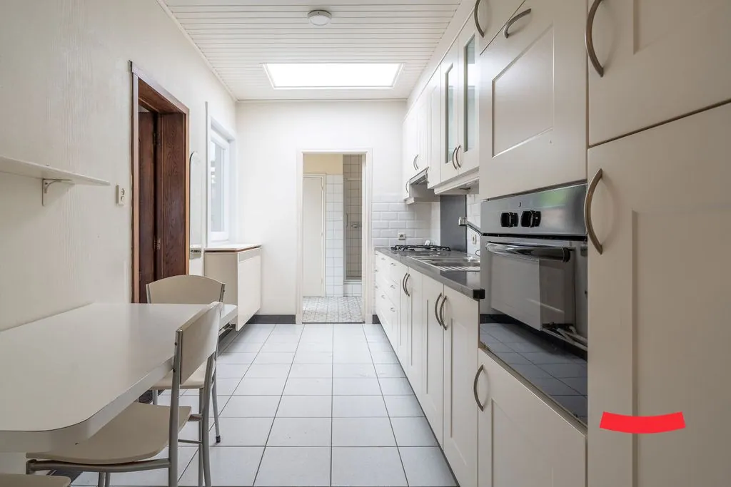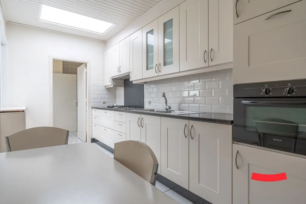 De keuken is voorzien van alle nodige snufjes en heeft een toegang ... naar de kelder. Verder zien we aansluitend een eerste badkamer, waar je ook de wasmachine kwijt kan. Ook de inpandige garage sluit aan bij de keuken.