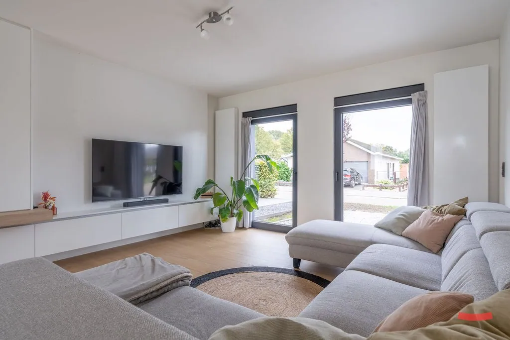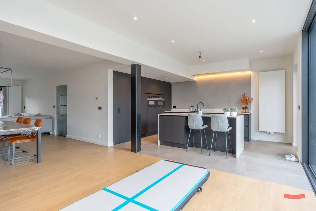 Verder stappen we de leefruimtes in. En je raadt het al: alle overbodige muren werden verwijderd, waardoor je optimaal het licht binnenpakt. En dat wordt nog eens extra in de verf gezet door de grote ramen aan de voorkant, en de gigantische schuifraam in de achtergevel. Verder is ’t een open lay-out, waar wonen, eten en koken heerlijk in elkaar overloopt. Het maatwerk bij de televisie krijg je er gewoon gratis bij. Cadeautje!