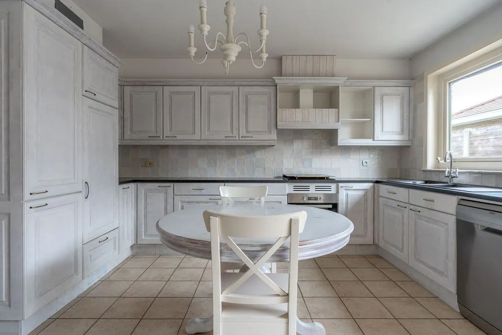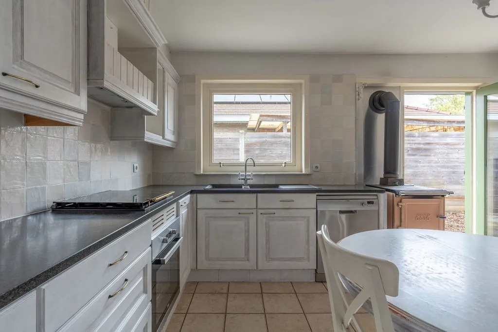 Aansluitend vinden we keuken. De oervlaamse bruine keuken – je kent het wel – werd al wat opgesmukt met nieuwe toestellen en een tof tegeltje boven het keukenblad. Verder werden de kastjes al in de grondverf gezet, dus je kan ‘m nog helemaal naar smaak afwerken. Kleine updates die zorgen een hele andere sfeer. Check trouwens ook de heerlijk ouderwetse kachel.