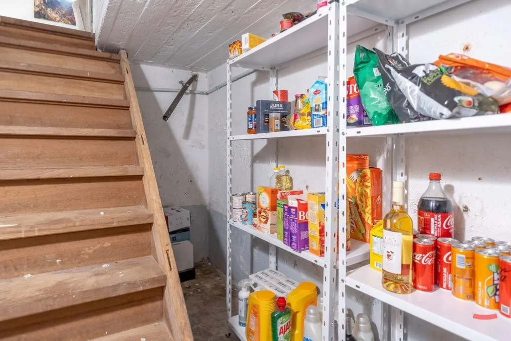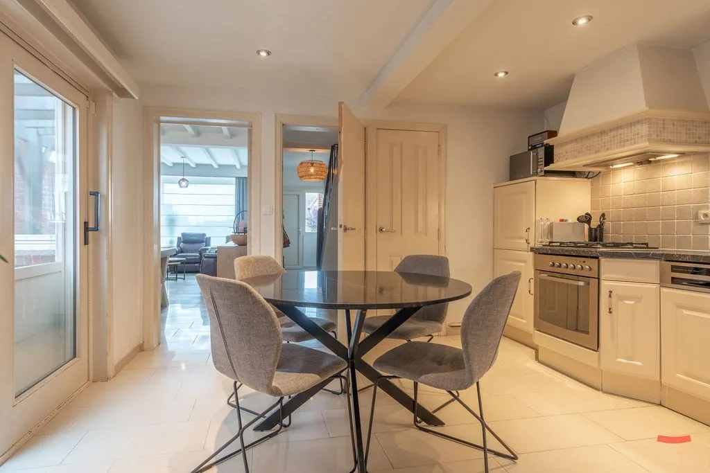 Een goeie binnenkomer, zo’n inkomhal. Geen balzaal, maar wel méér dan voldoende ruim om je jassen en schoenen een plekje te geven. Verder stappen we de keuken in. Deze werd een aantal jaren geleden in een nieuw jasje gestopt, dus ze kan zeker nog een rondje mee. Alle snufjes zijn aanwezig, en extra rommeltjes/voorraad kan je kwijt in de handige kelderberging.