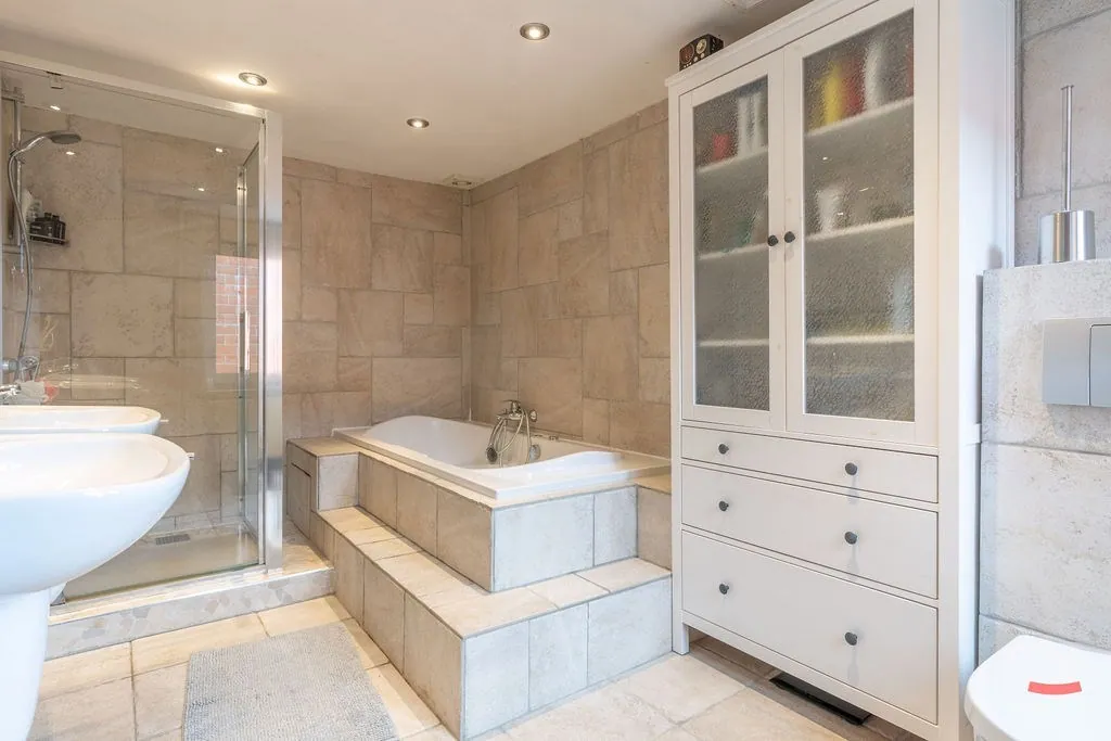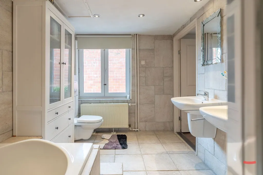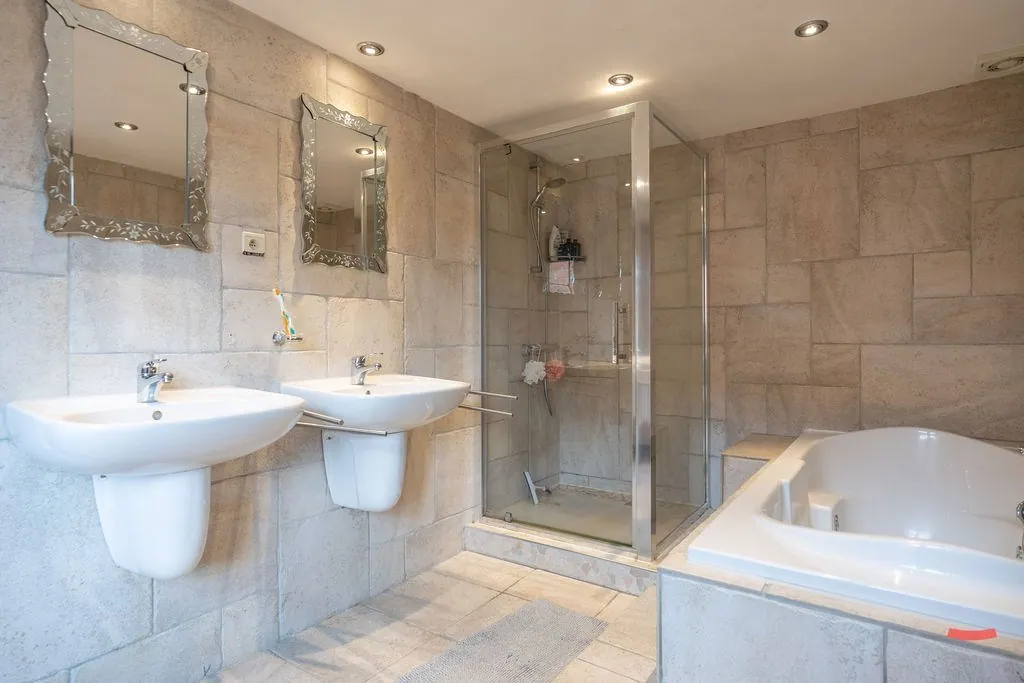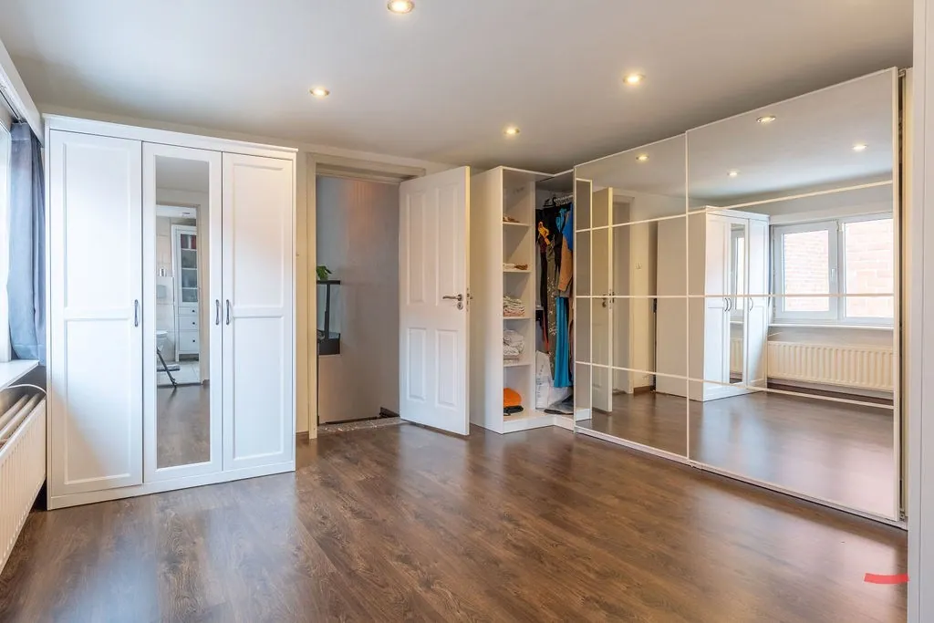 Als we binnen onze wandeling verderzetten, vinden we op de 1ste verdieping 3 slaapkamers. De slaapkamer aan de achterzijde werd momenteel ingericht als riante inloopkast, met aansluitend de badkamer. Ook deze werd een aantal jaren geleden vernieuwd, en werd voorzien van een bad én douche, dubbele wastafel en een toilet.