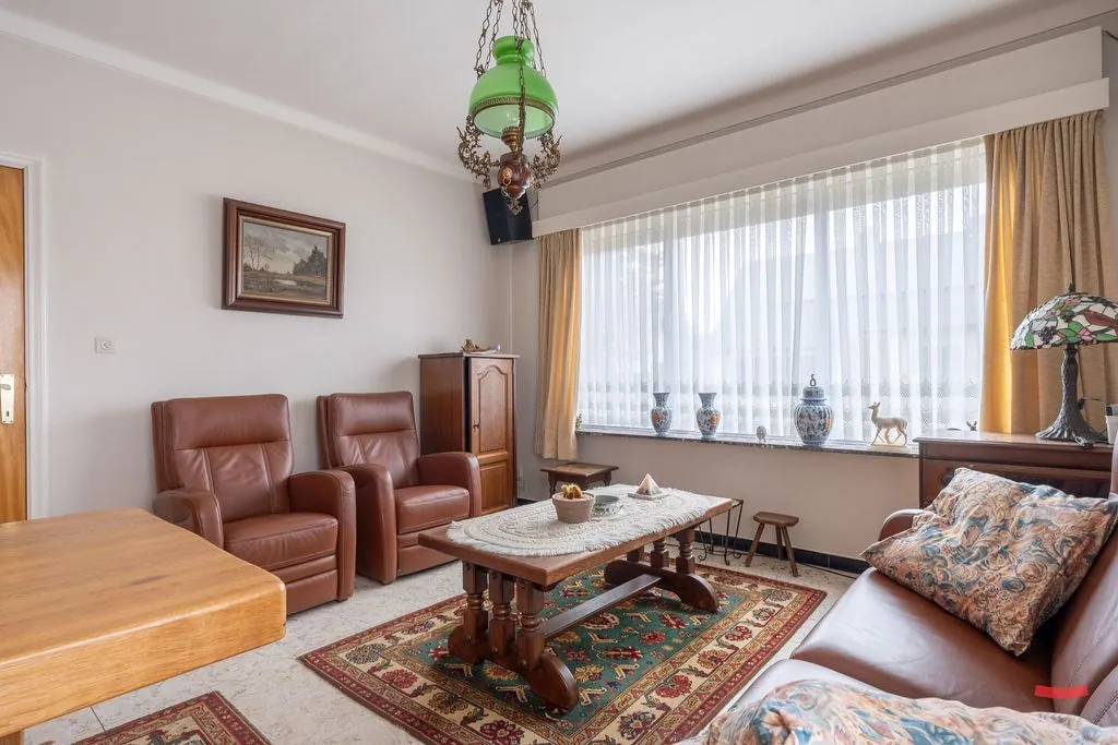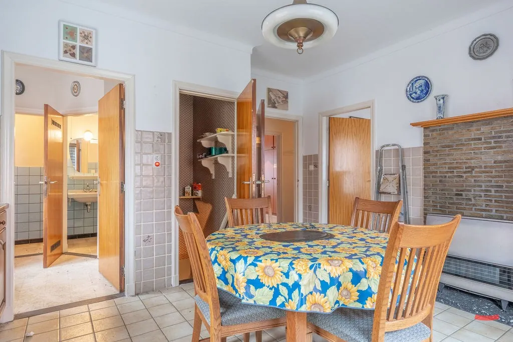 Zullen we eerst links beginnen? Daar stappen we de woonkamer in. Verrassend licht, toch? Geen balzaal, maar wel een fijne ruimte om je ding mee te doen. Graag nog iets meer vrijheid? Wat dacht je van het slopen van de muur tussen woonkamer en keuken? De keuken lijkt trouwens misschien ietwat gedateerd, maar mits wat opsmukwerk kan deze heus nog wel een rondje mee.