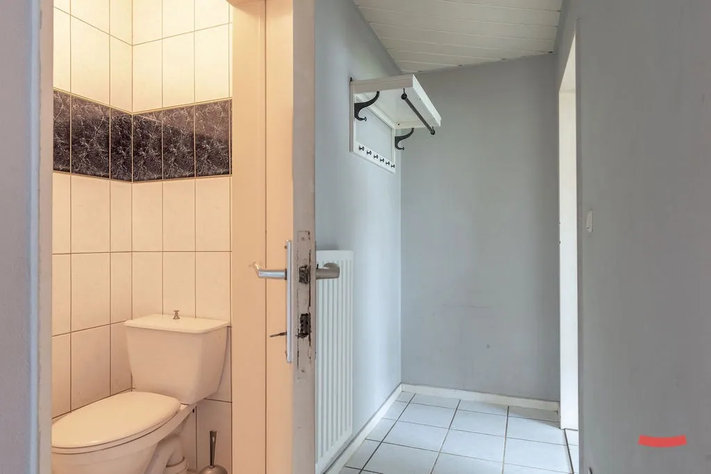 Verder komen we in de hal. Een centrale uitvalsbasis naar al je kamers: een apart toilet, ... badkamer, 4 slaapkamer en de inpandige garage. Praktisch en duidelijk.