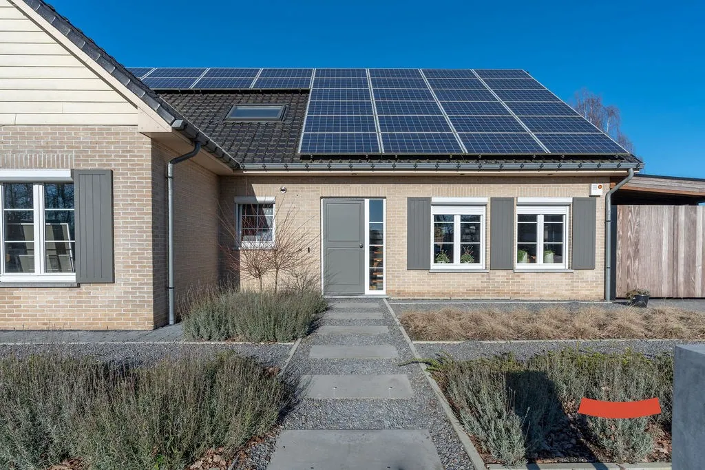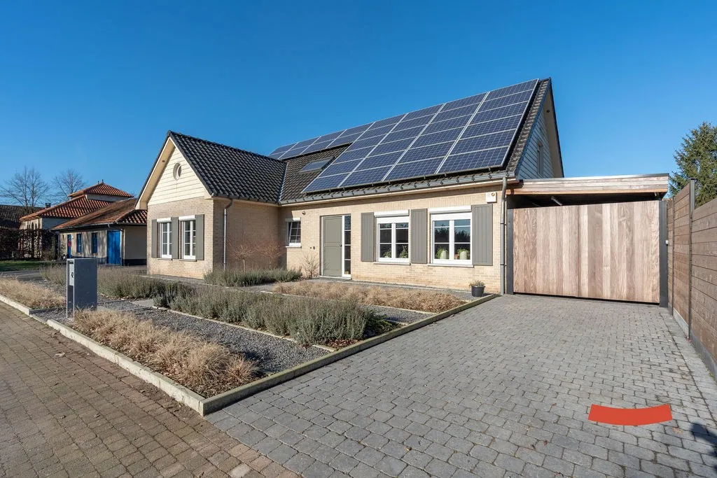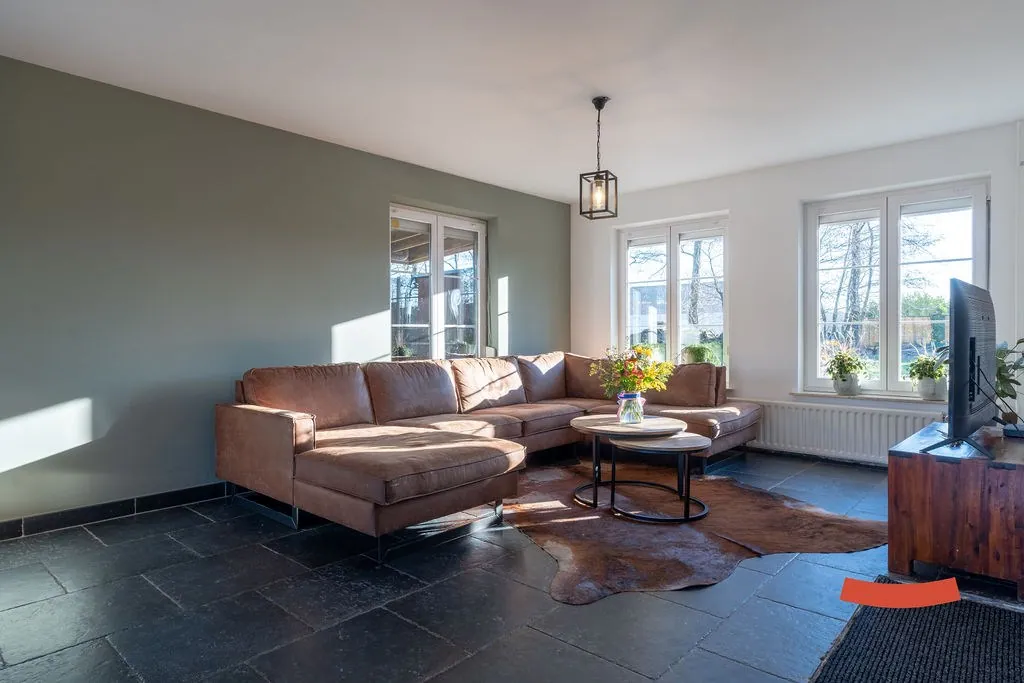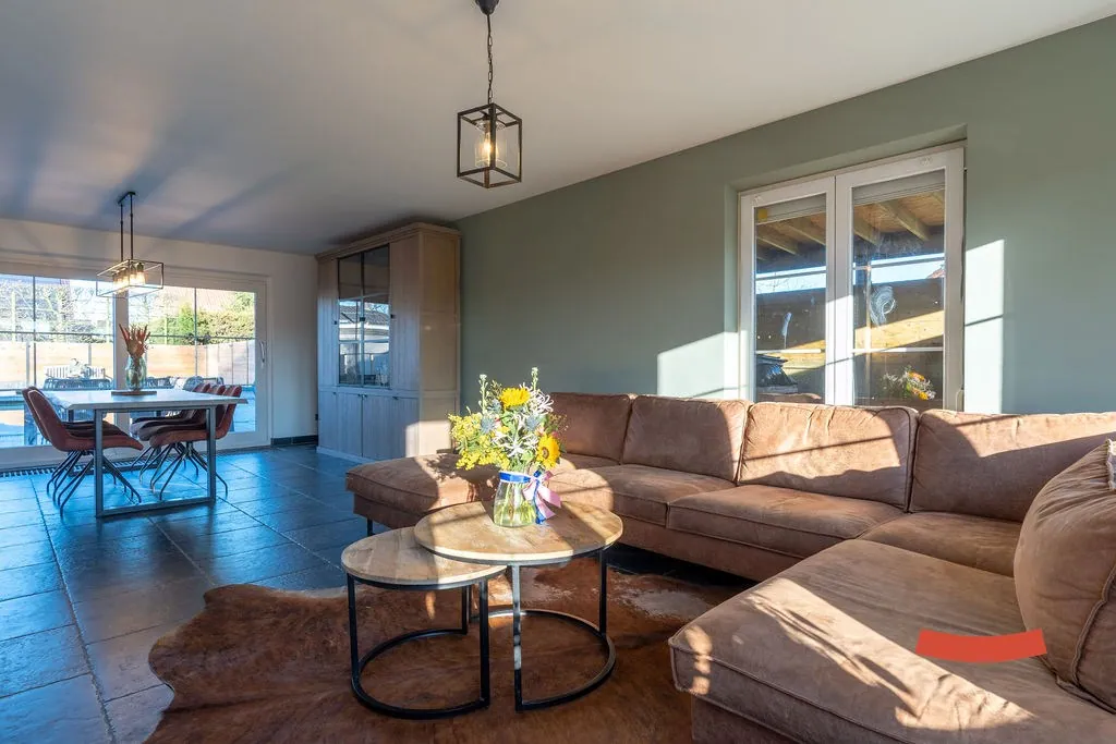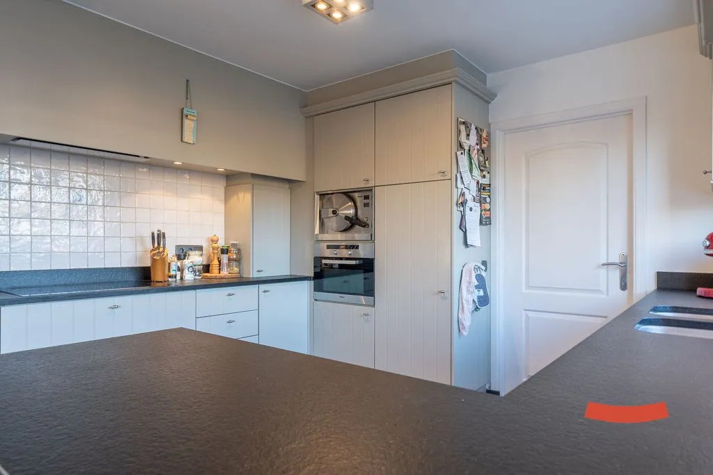 Een heerlijke ruimte, die woonkamer met open keuken. Niet alleen voelt ie erg ruimtelijk aan, maar bovendien geniet je ook optimaal van de lichtinval en het omliggende groen. Aansluitend zien we de vernieuwde keuken met alle nodige snufjes. De afwas doen en ondertussen de kinderen in ’t zwembad in de gaten houden? Dubbelcheck! (Of nog beter: de kinderen laten afwassen terwijl mama/papa aan het zwembad ligt.) Naast de keuken vinden we nog een wasplaats met toegang naar de ... achtertuin.