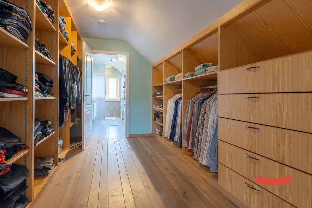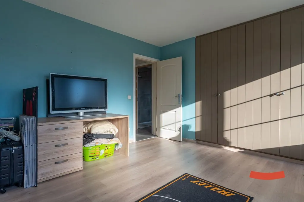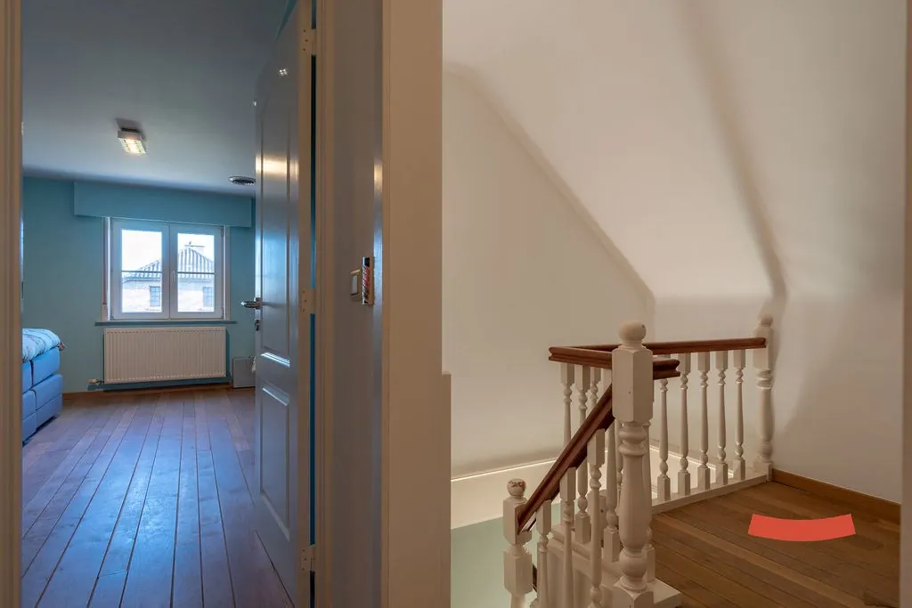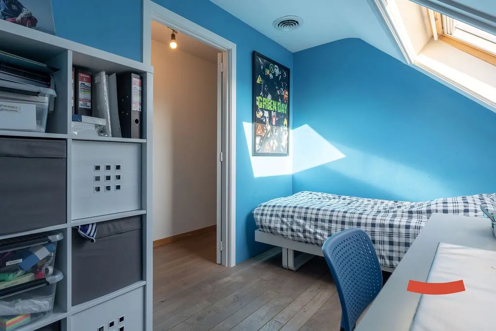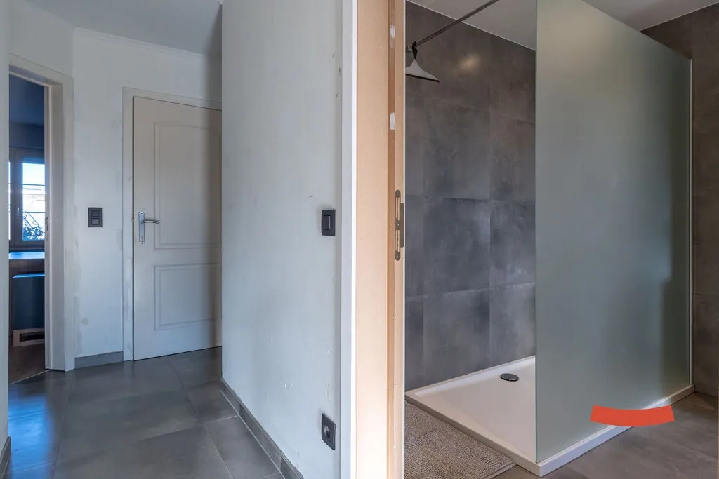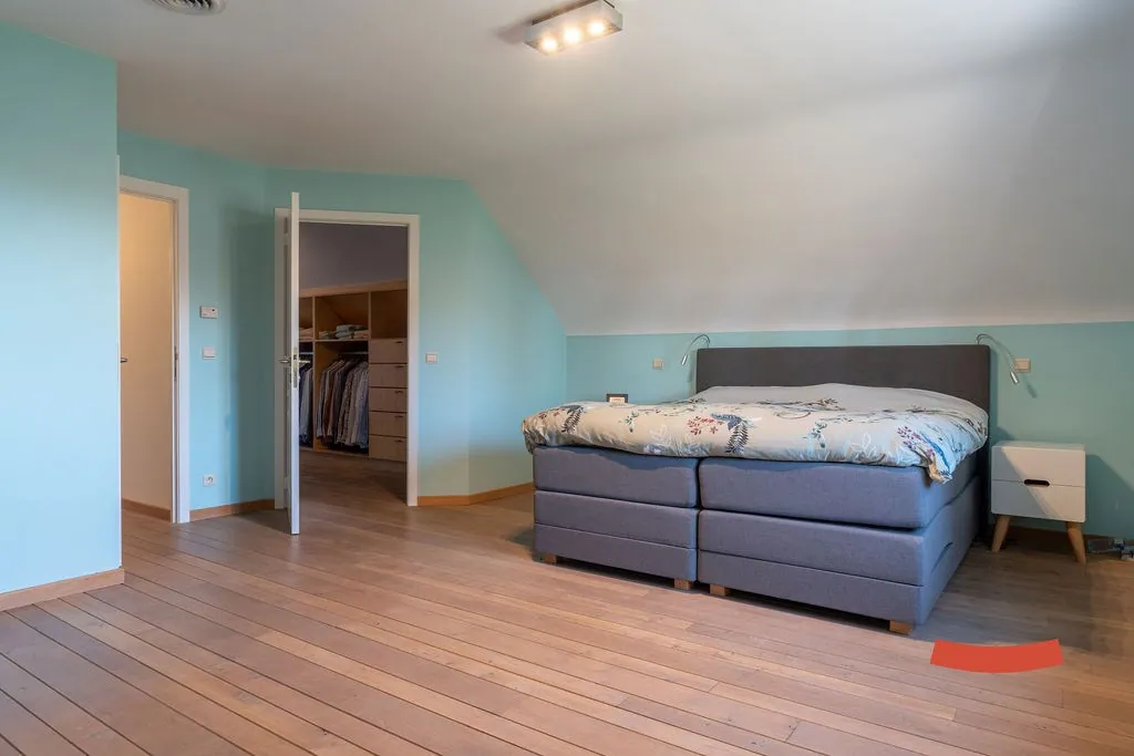 Boven zijn nog 3 bijkomende slaapkamers, waarvan de riante master bedroom voorzien is van een eigen inloopkast en toegang naar de 2de badkamer. Deze keer met een bad, douche, dubbele wastafel en toilet. De badkamer is trouwens ook toegankelijk via de nachthal.