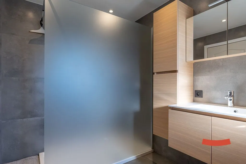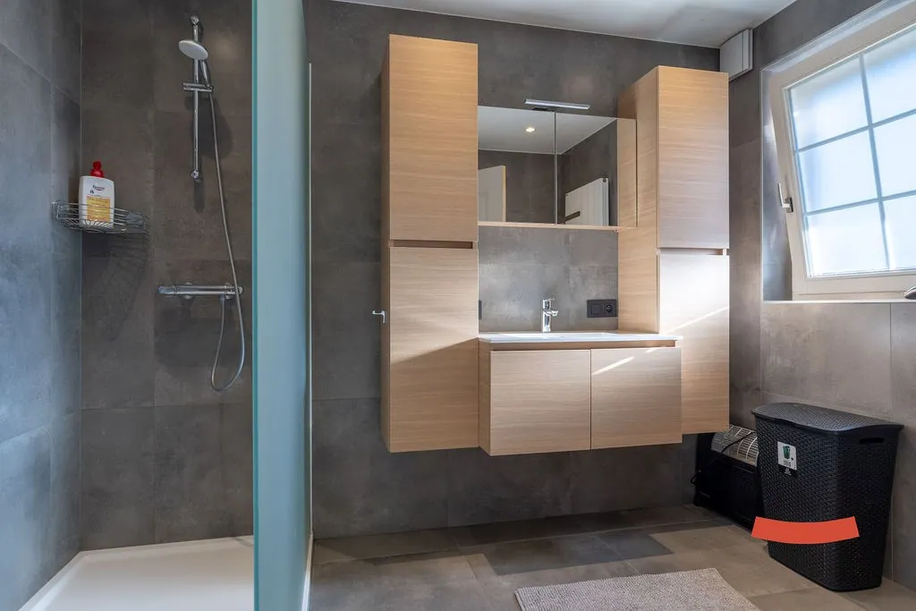 Verder zijn er beneden 3 slaapkamers, waarvan 2 voorzien werden van vaste kasten. Ook vinden we hier een badkamer met een ruime inloopdouche, badkamermeubel en toilet. Er is tenslotte nog een gastentoilet.