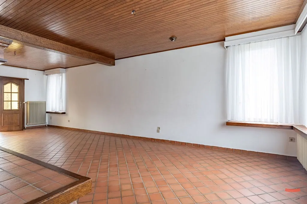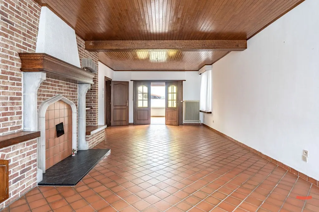 Verder vinden we de woonkamer. Een fijne ruimte met veel lichtinval en openslaande deuren naar de achterliggende veranda. Gezellig! Is de woonkamer net iets te oldskool naar je zin? Stiekem vinden we dat net heel ... charmant, maarrr met een goeie lik verf en een toffe parketvloer krijg je meteen al een hele eigentijdse look.