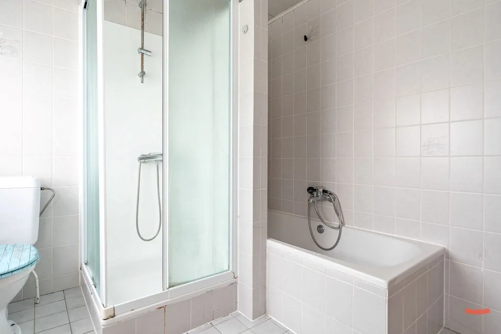 Ook de badkamer zit boven. Dit is een opknapper, maar een fijne ruimte om je ding te doen. Méér dan voldoende groot voor een bad, inloopdouche, wastafel en een toilet.