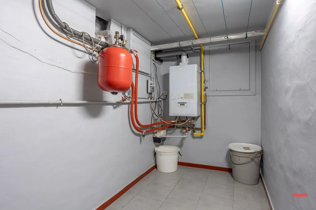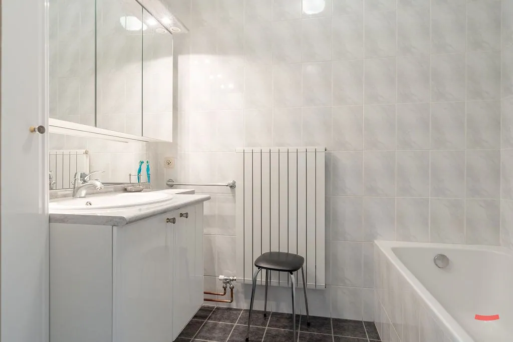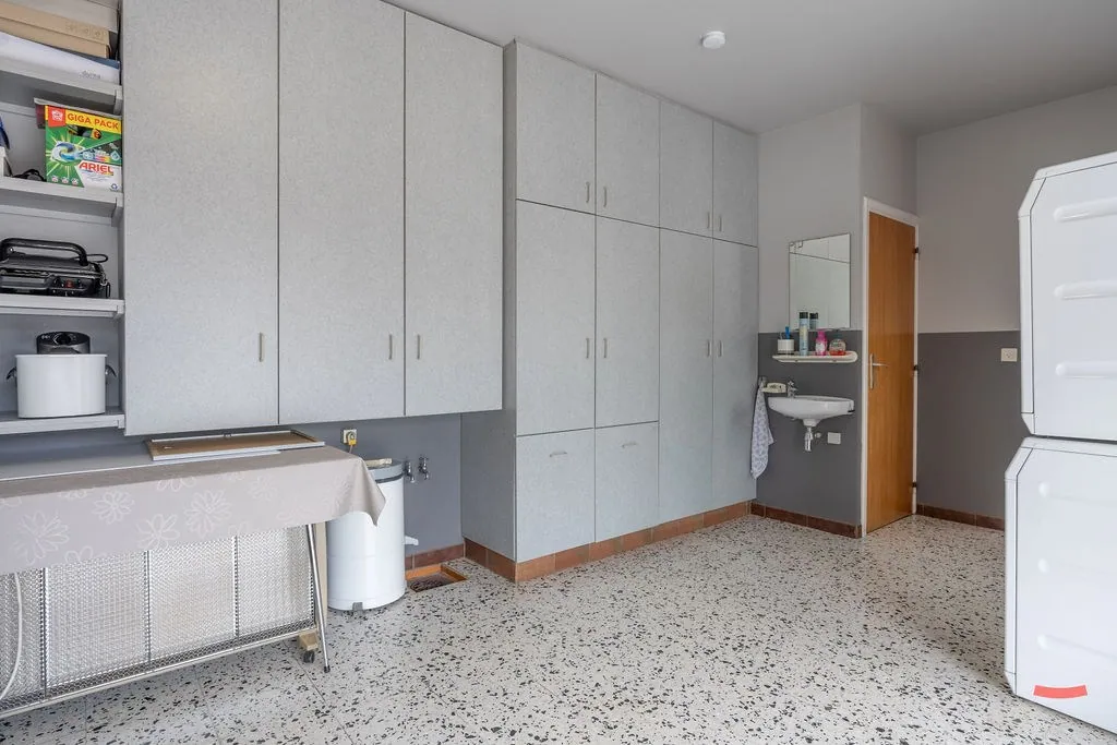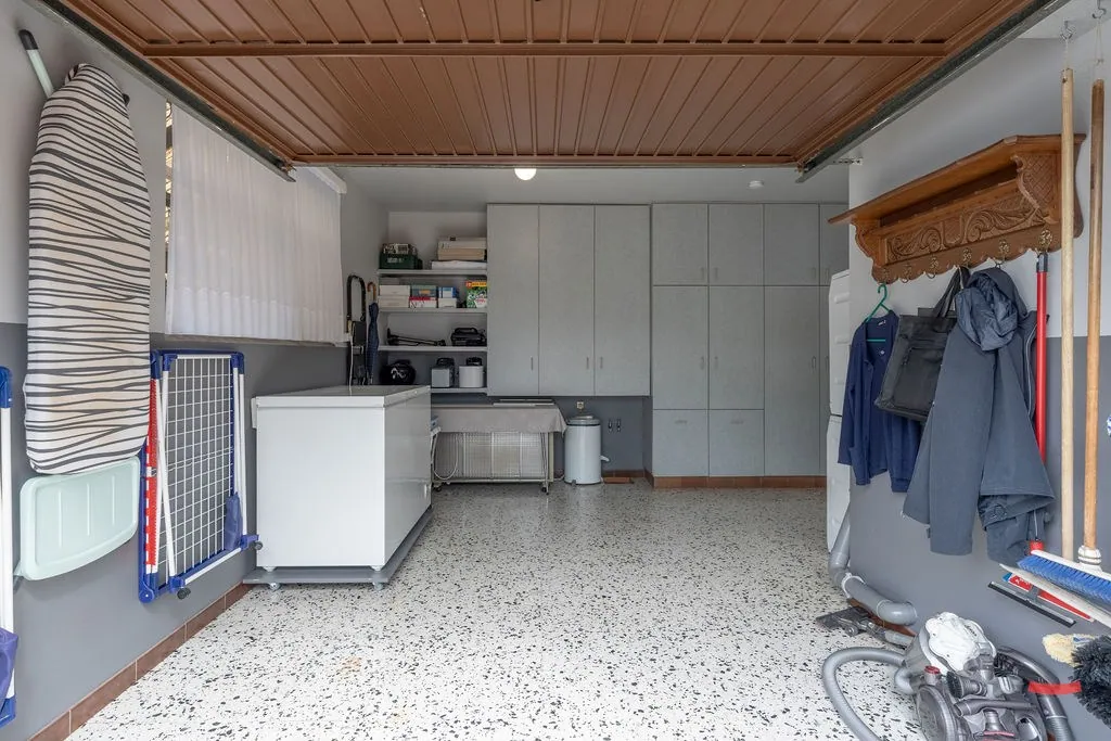 Verder vinden we beneden nog de badkamer, een apart toilet en een grote inpandige garage. Deze laatste doet de voorbije jaren voornamelijk dienst als grote bergruimte, dus ze werd erg netjes onderhouden. Ook zitten hier de aansluitingen voor wassen en drogen.