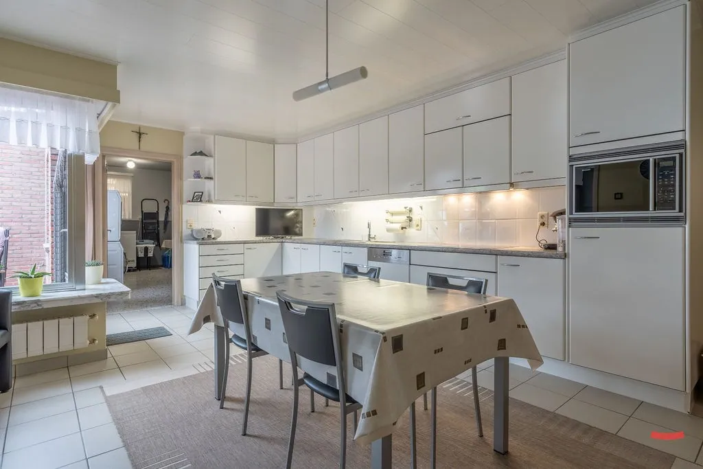 Zullen we een keer bij de achterdeur starten? Want zo doen we dat in een dorp, toch? En dan kom je meteen in de grote troef van het huis. Een gigantische keuken! In dit geval écht het hart van het huis, want heel wat peuters hebben hun groentepapje gekregen bij deze lieve onthaalmoeder. Deze makelaar was er eentje van, dus we kunnen je toevallig garanderen dat er met liefde in dit huis gewoond werd. De keuken heeft al wat jaren op de teller, maar door het uitmuntende onderhoud kan deze écht nog wel een rondje mee.