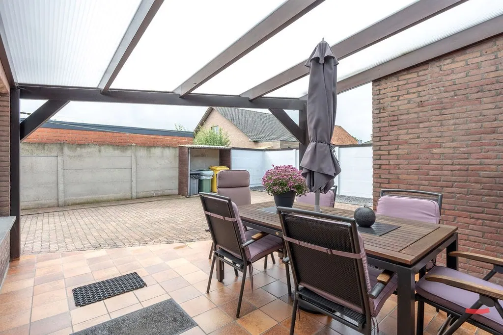 De tuin werd aan de achterzijde volledig verhard, want de bewoners houden van – je raadt het al – clean en overzichtelijk. De tuin werd teveel gedoe, dus dan maar nette tegels. Iets te veel van ’t goeie? Doe een rondje tegelwippen, en dan maak je daar in no time een fijn tuintje van. Er is een fijn overdekt terras, en een schuurtje.