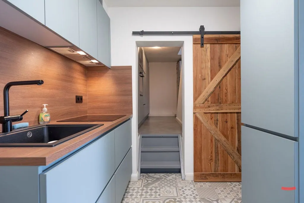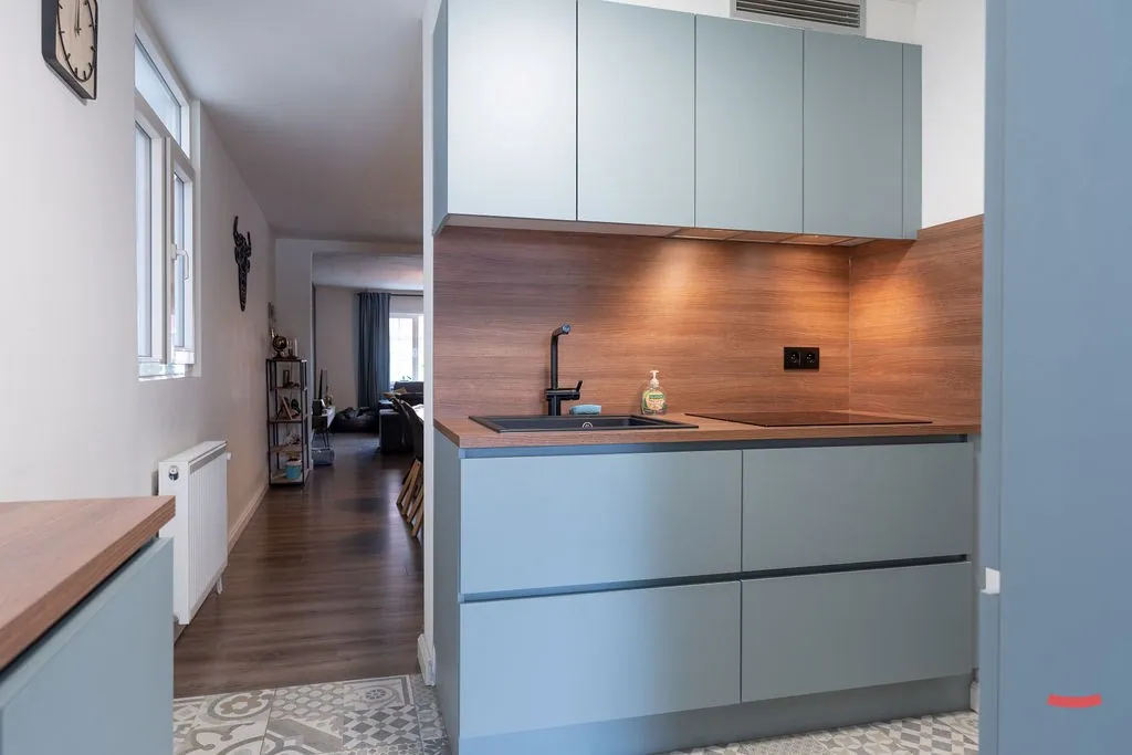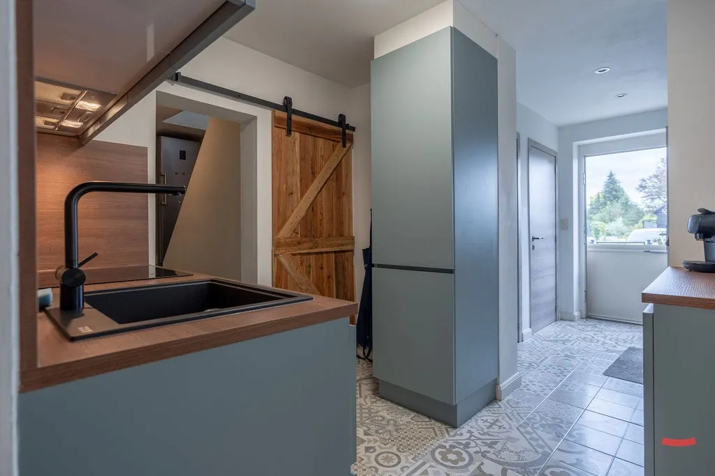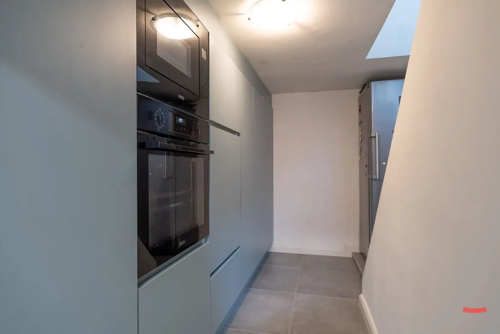 Aan de achterzijde vinden we de keuken. Ook deze werd volledig vernieuwd, en voorzien ... van alle nodige snufjes. Heb je trouwens gespot dat écht alle hoekjes en kantjes perfect benut werden? Naast de keuken is nog een handige (voorraad)kelder.