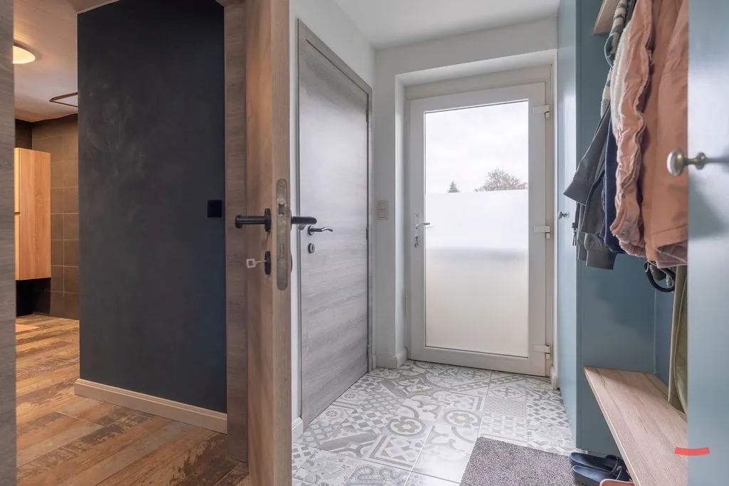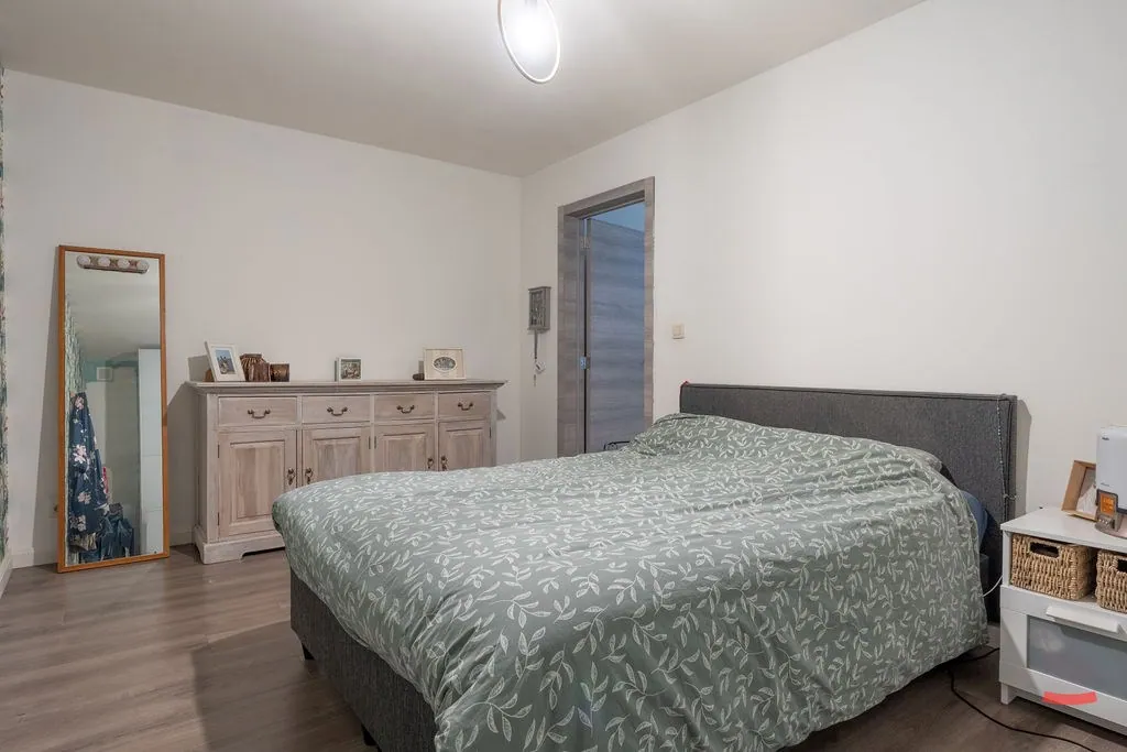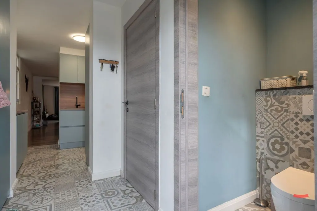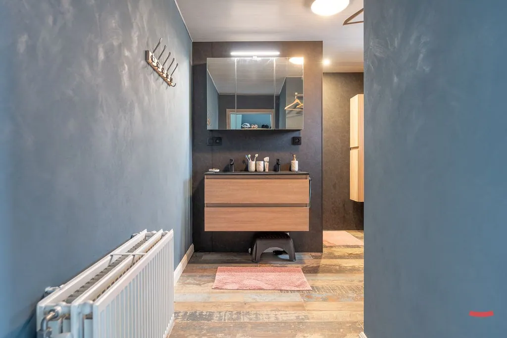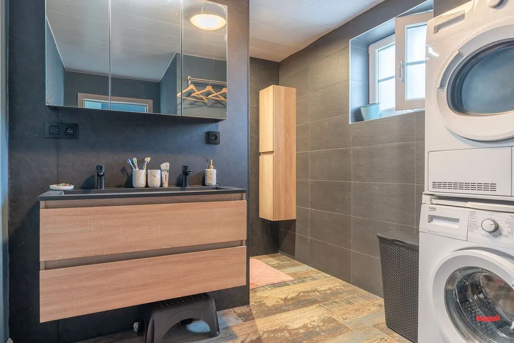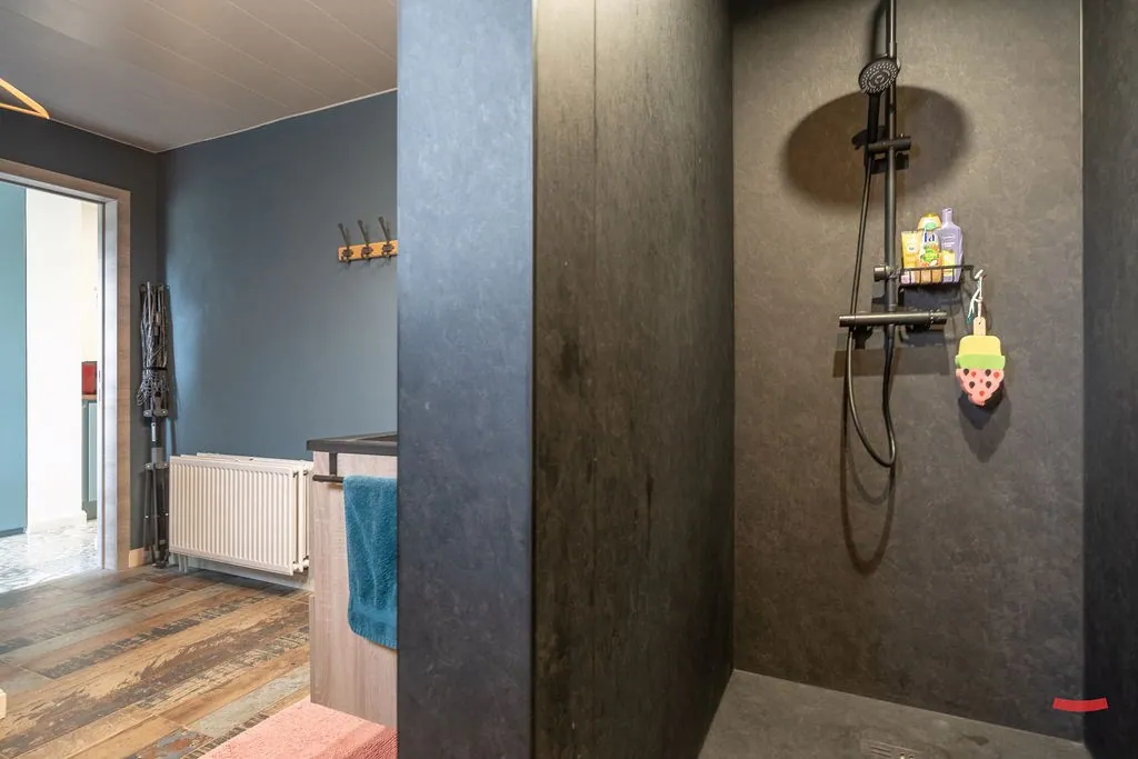 Helemaal achteraan werd de badkamer voorzien, met badkamermeubel en grote inloopdouche. Hier vind je ook de aansluitingen voor wassen en drogen. Het toilet tenslotte is apart.