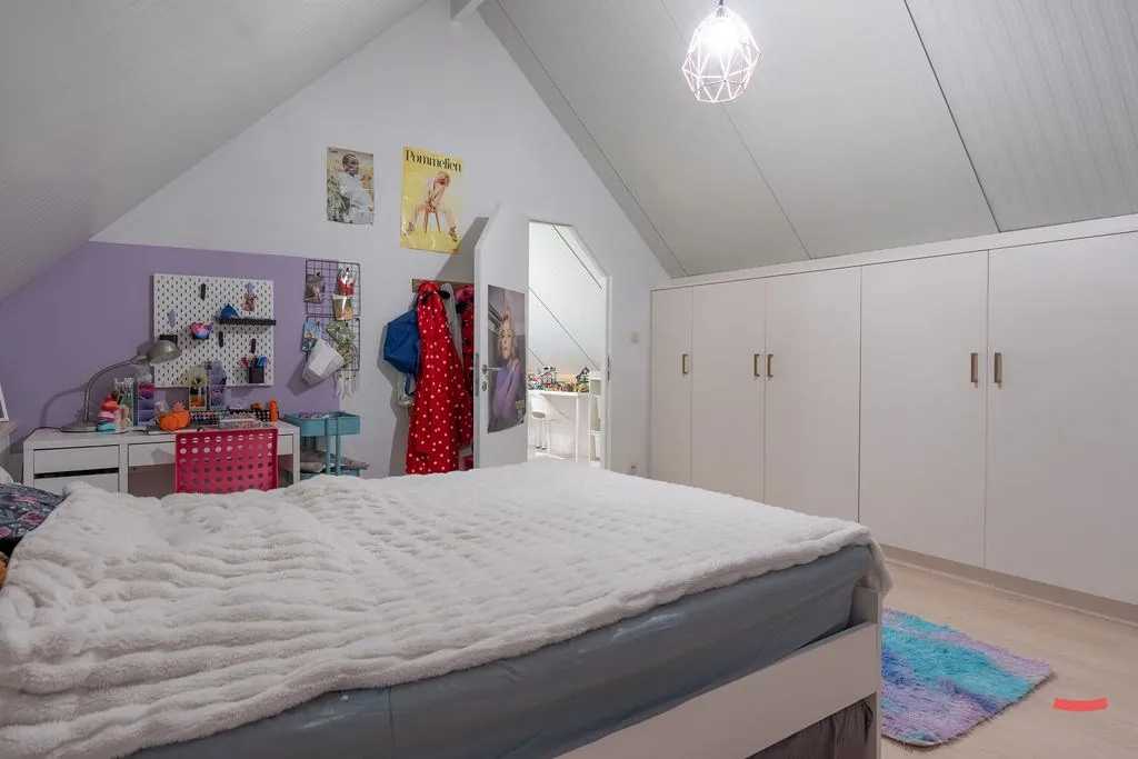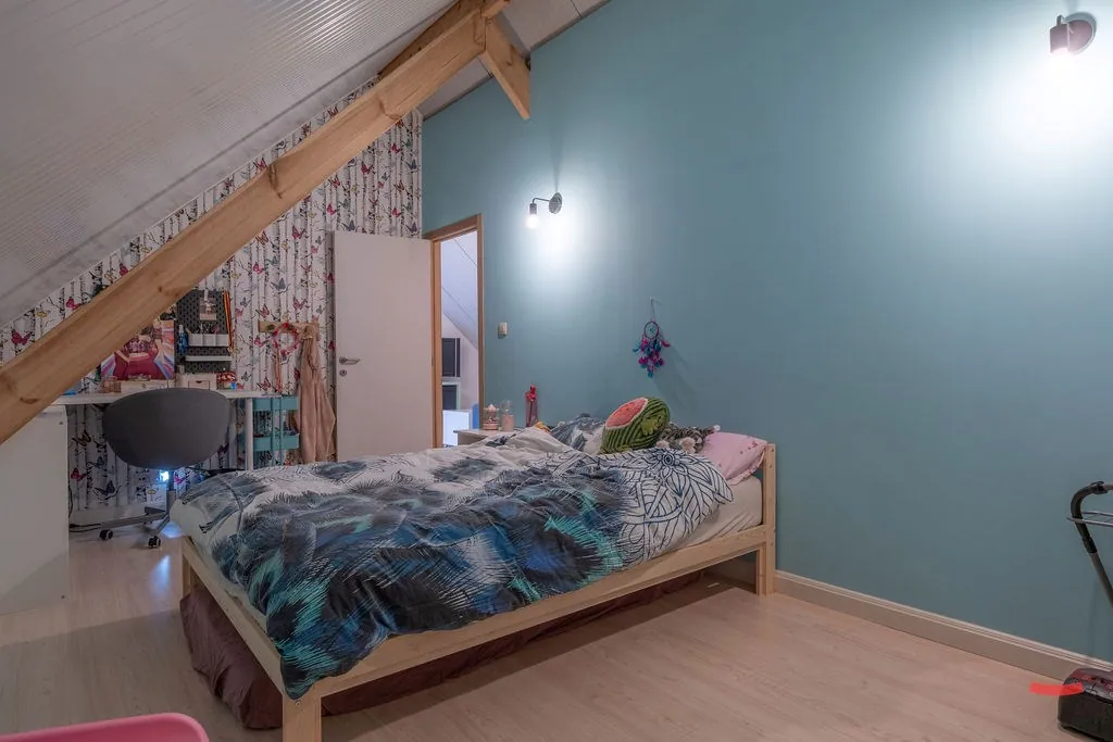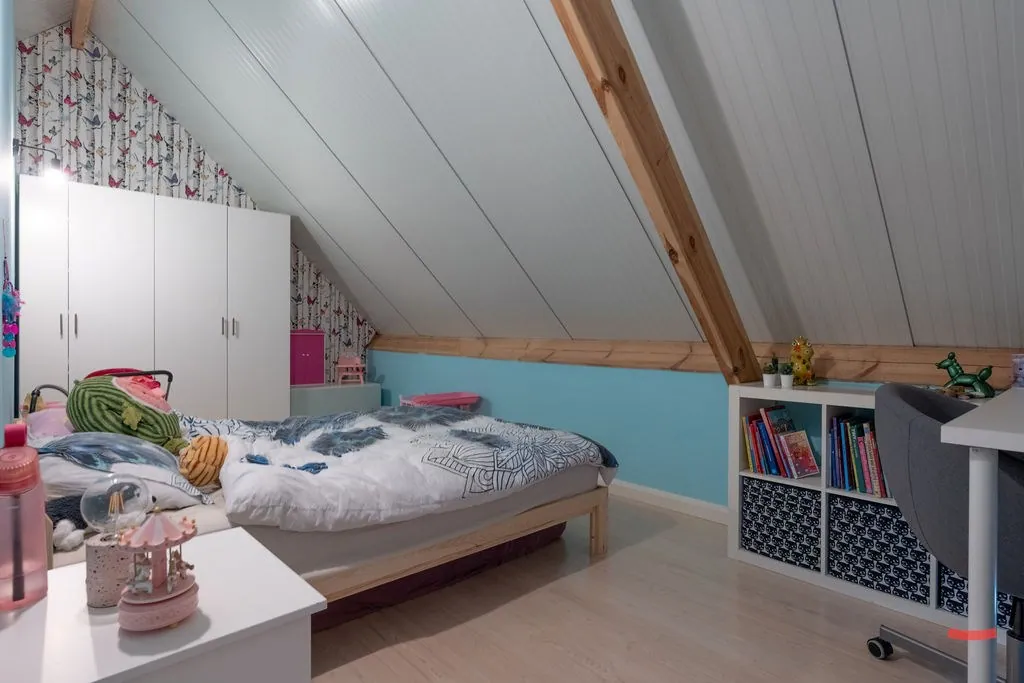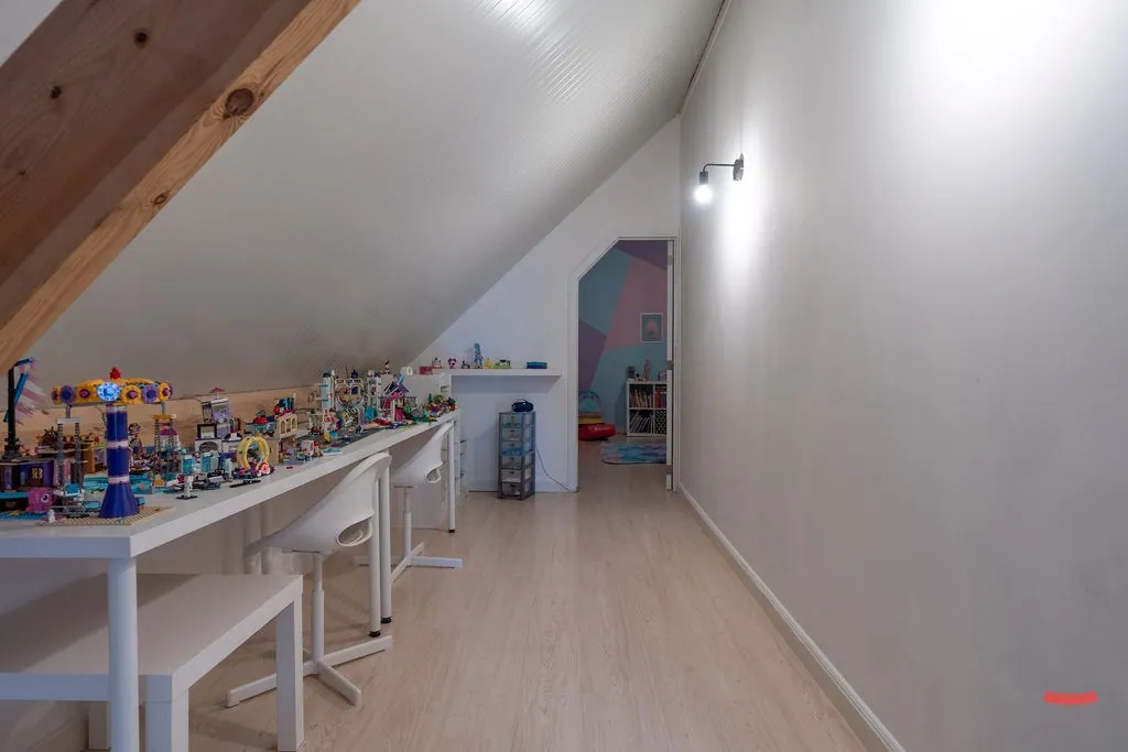 En dan die bovenverdieping….geen klein zoldertje, maar een speelparadijs voor de kids. Er zijn 2 grote slaapkamers, een handige bergruimte en nog héél wat ruimte voor een gamecorner, creatafel, lounge om te chillaxen of nog andere hippe dingen die de jeugd tegenwoordig doet. (De alerte kijker heeft gezien dat er momenteel geen raam in de slaapkamer zit, maar dat kan gemakkelijk via het dak of voorgevel.)