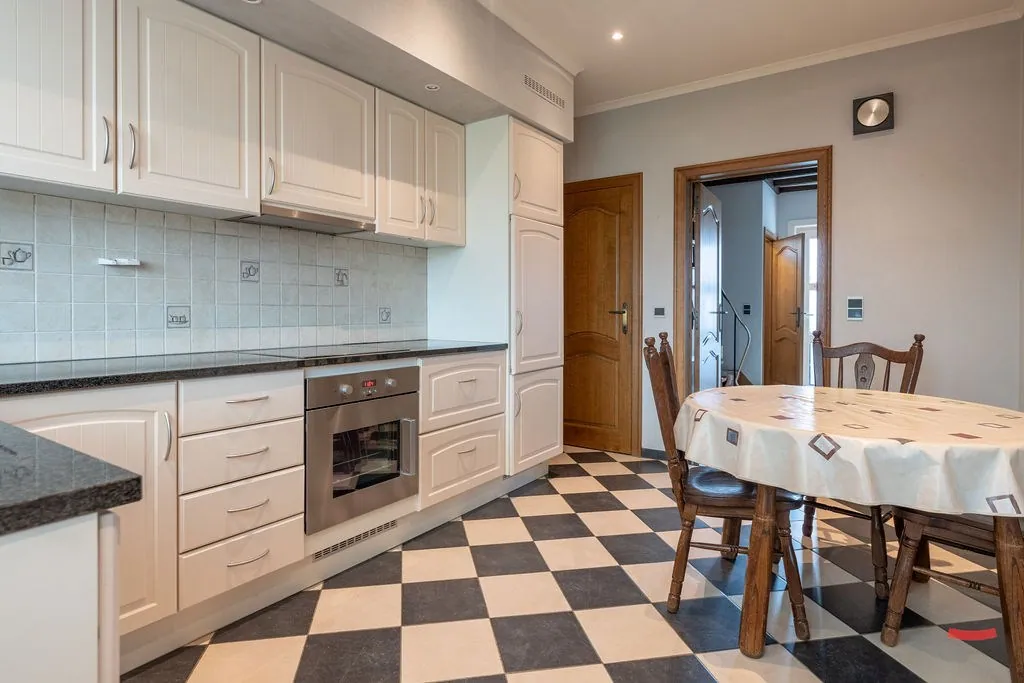 De ... keuken zit ernaast. Deze werd een aantal jaren geleden in een nieuw jasje gestopt, dus die kan zeker nog een rondje mee. Aansluitend zit nog een handige (en grote) voorraadkelder.