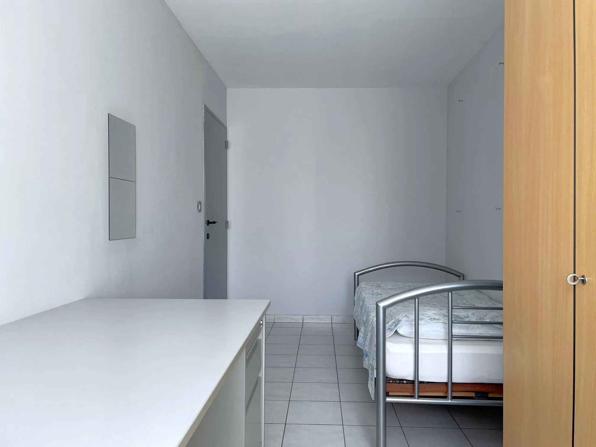 De badkamer is basic, maar netjes, en werd voorzien van een bad met douchescherm en een wastafel. Verder zijn er maar liefst 3 grote (!) slaapkamers, waarvan eentje ook toegang geeft naar de achterdeur. Want jawel, je kan ook via de achterkant binnen.