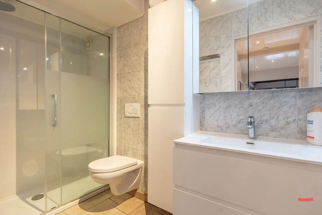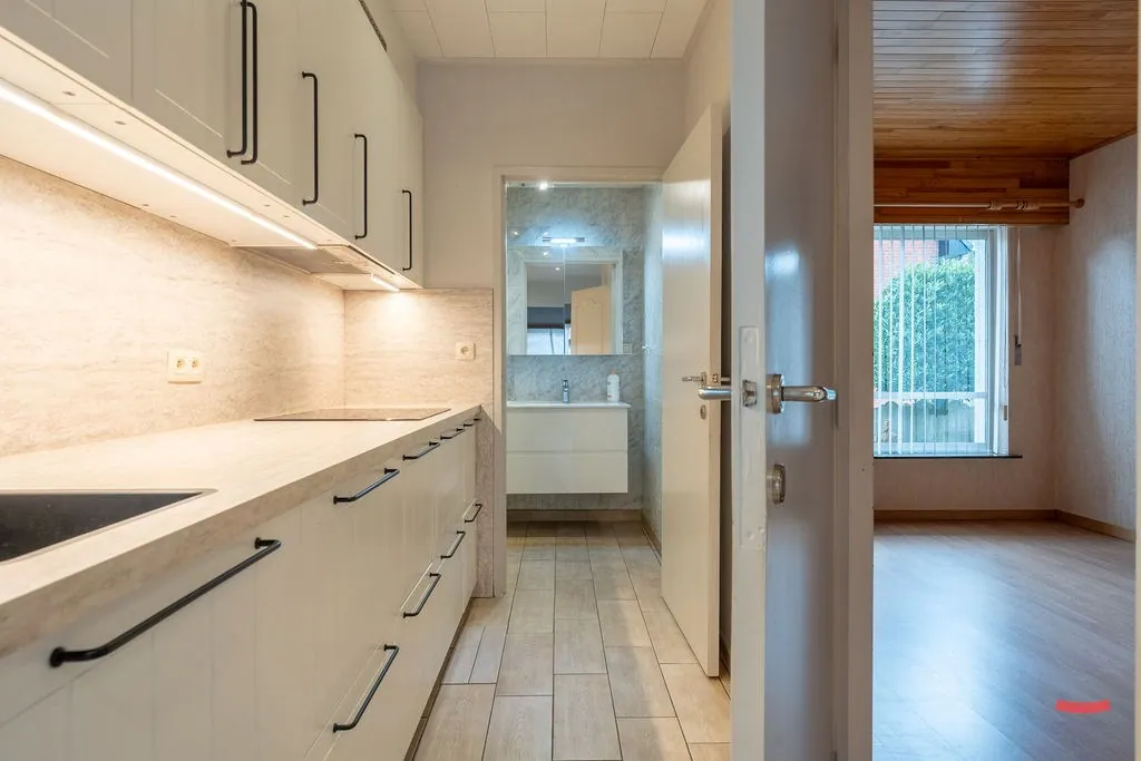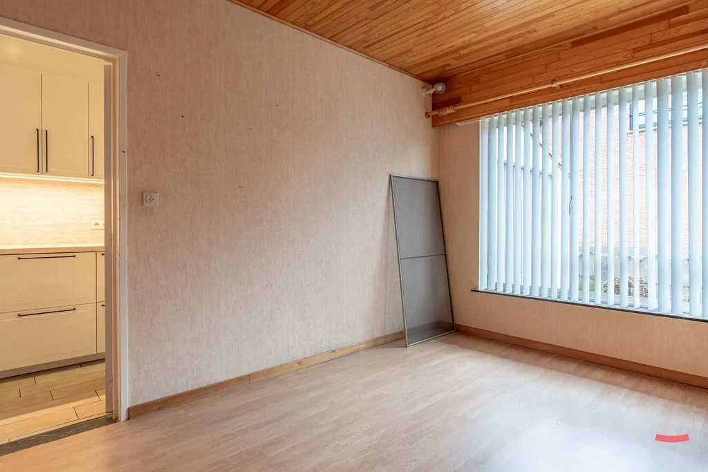De woonkamer is op z’n minst charmant te noemen, toch? Een gezellige ... parketvloer, sfeervolle houten balken en dé showstopper van de huidige eigenaar: de handgemaakte schoorsteenmantel. Aansluitend vinden we de verrassend open keuken, die enkele jaren geleden in een nieuw jasje werd gestopt. Verder zit om de hoek nog een 2de slaapkamer, en de badkamer.