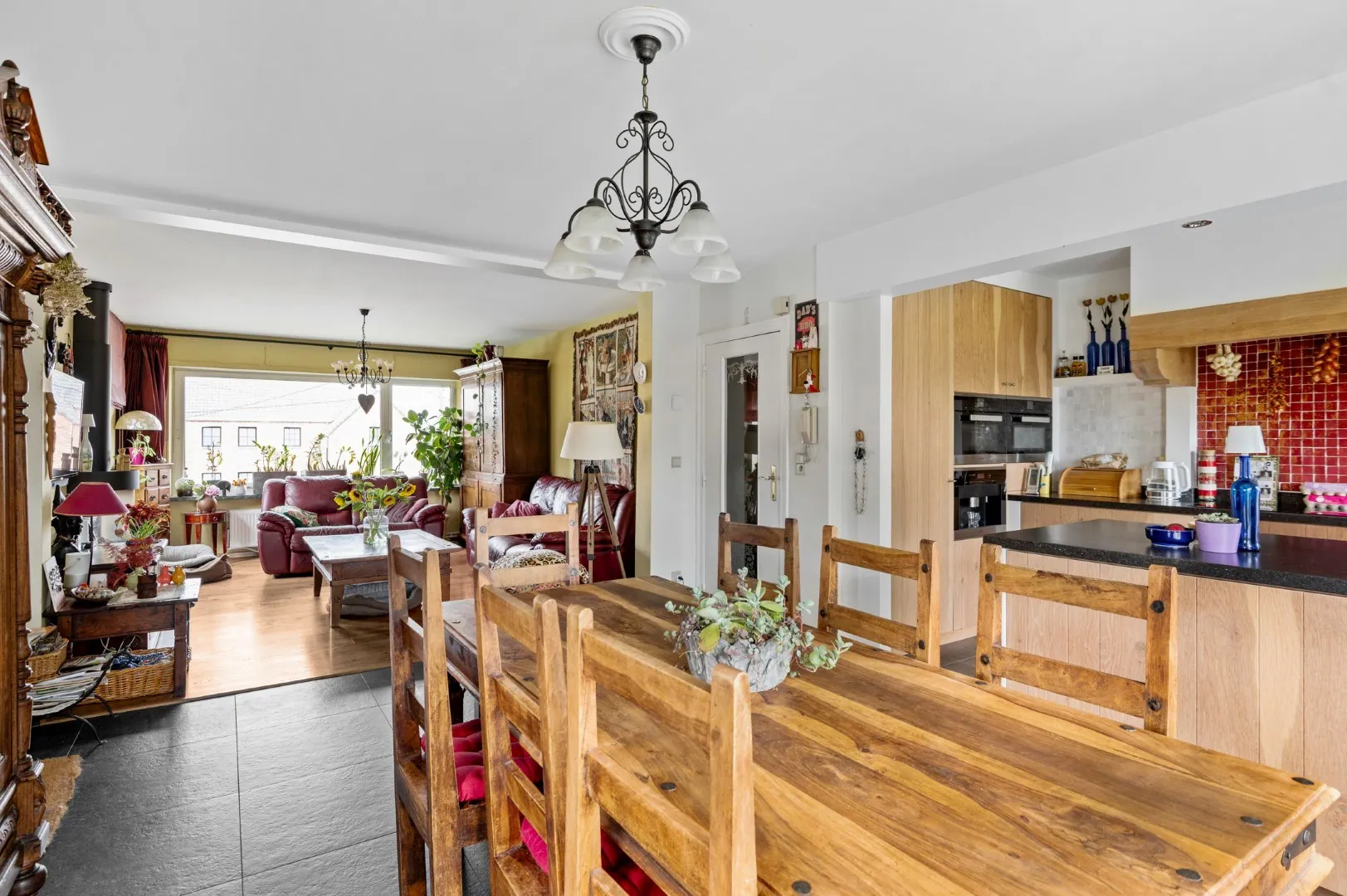 Op de eerste verdieping komen we op privé terrein, en we starten in de woonkamer met open keuken. Wat je meteen opvalt? Check die grote ramen! De keuken werd recent vernieuwd, en is dus instapklaar. Via de woonkamer wandel je trouwens de veranda in, die toegang geeft naar de tuin.