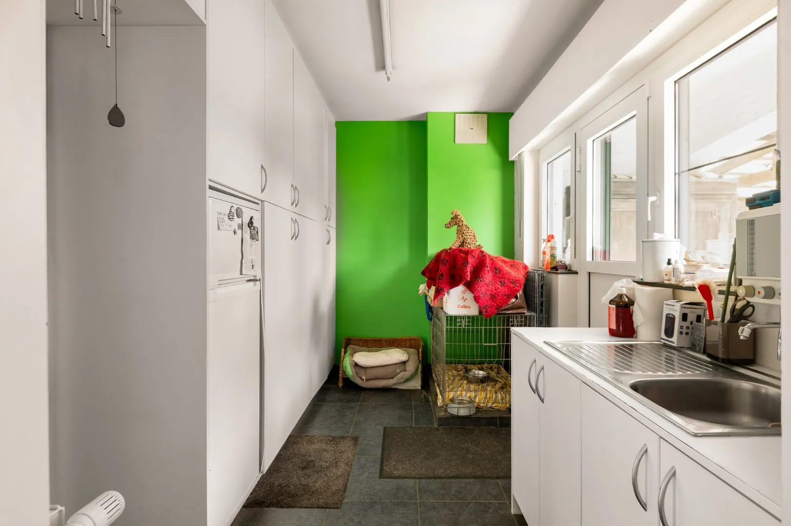 Zullen we beneden starten? Wat voordien een kantoor was, werd later omgevormd naar een dierenartspraktijk, met ... volgende kamers: grote inkomhal met apart toilet, wachtruimte/bureau, praktijk, kantoor, badkamer/wasplaats, keuken en een inpandige garage. De commerciële ruimtes werden een tijdje geleden volledig in een nieuw jasje gestopt, zonder hun residentiele functie te verliezen. Je kan ‘m dus perfect zowel commercieel of als ’n privéwoonst gebruiken. Deze vloeroppervlakte bedraagt maar liefst 175m ²!