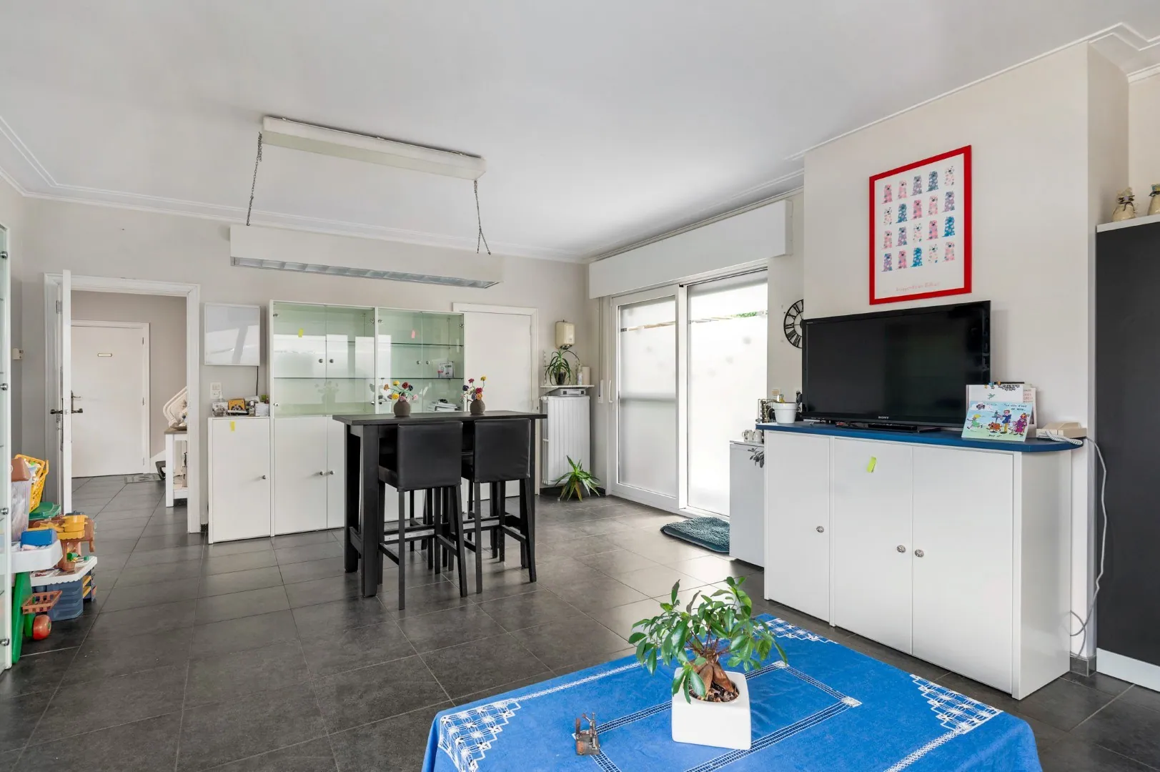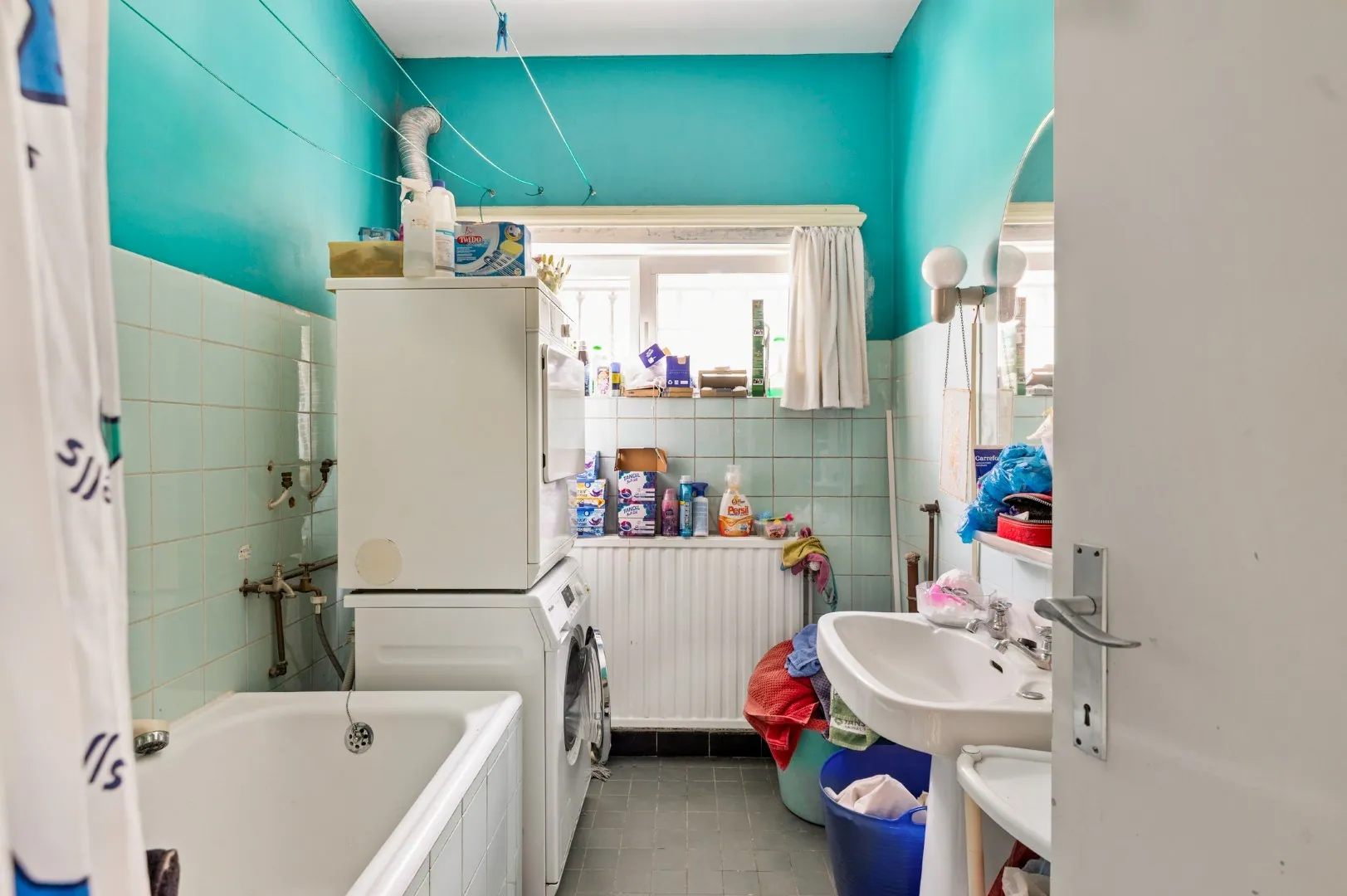 Op dit moment werd de woning onderverdeeld in een gelijkvloerse praktijkruimte met een grote bovenwoning. “Verdeeld” mag je trouwens echt letterlijk nemen, want de meters zijn apart en ook zijn er aparte toegangen.