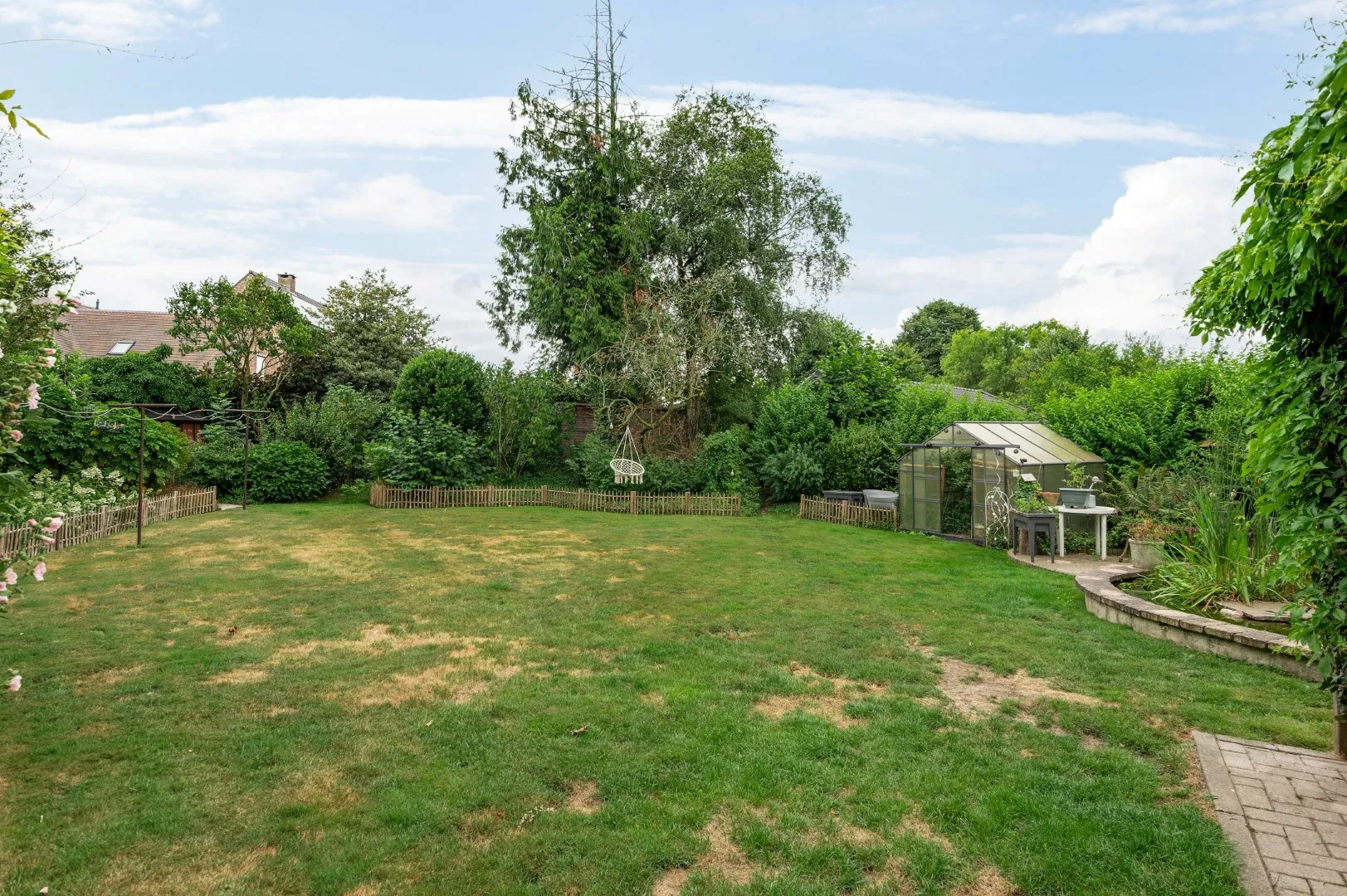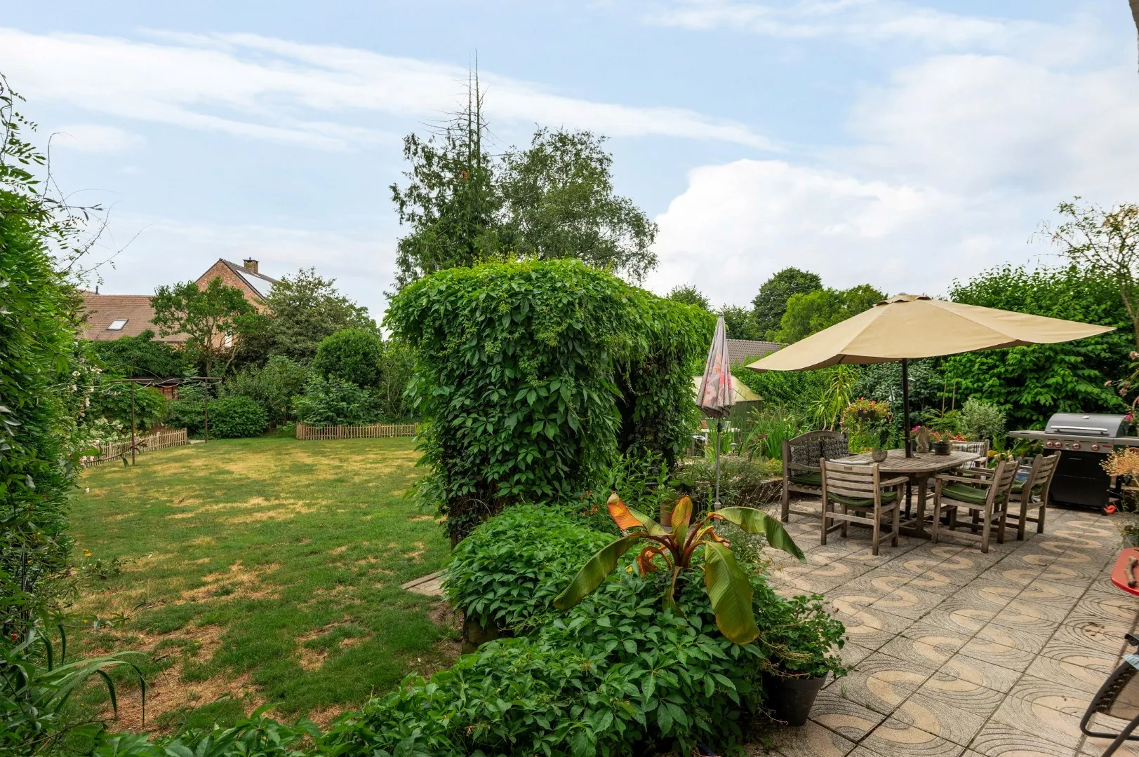 Bij een groot huis matchen we graag een grote tuin, dussss: een perceel van 1210 m², omringd door bomen en grote struiken voor privacy. Niet teveel strakke lijnen, maar een natuurlijke, romantische tuin die de sfeer van het huis extra in de verf zet. Langs weerzijden van het huis zijn carports, en bij de voorzijde heb je extra parkeergelegenheid.