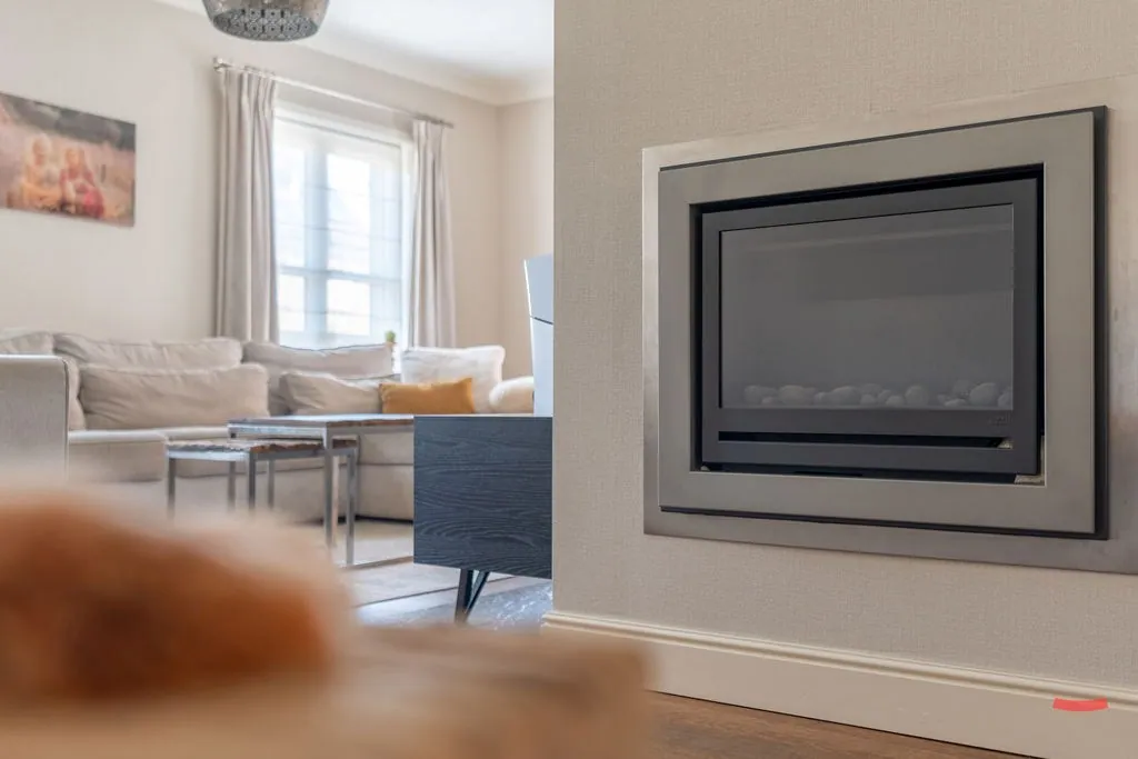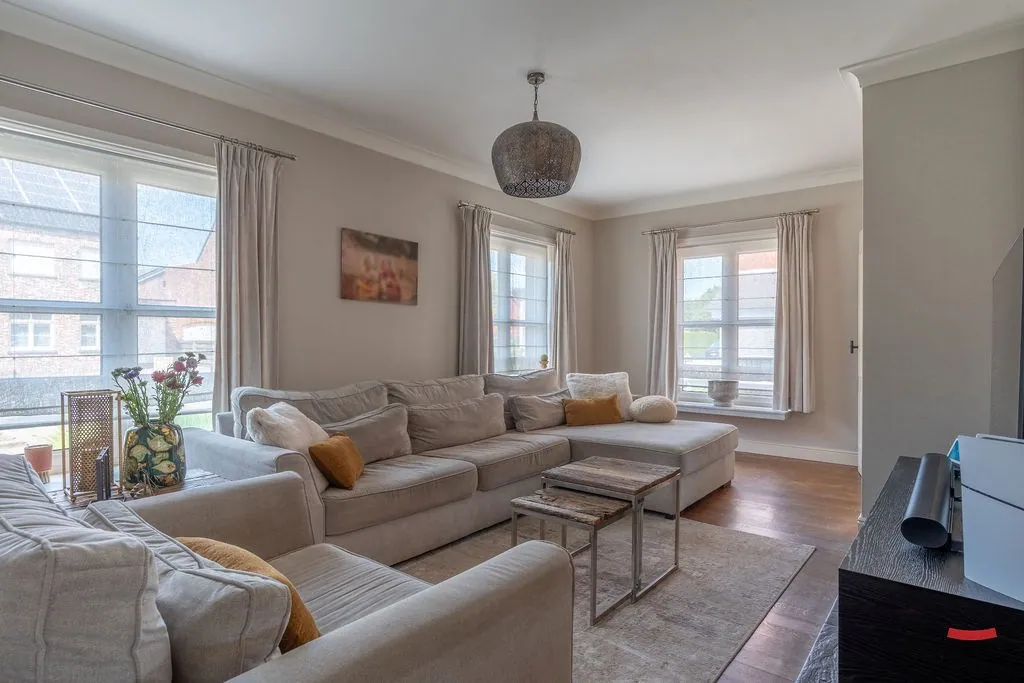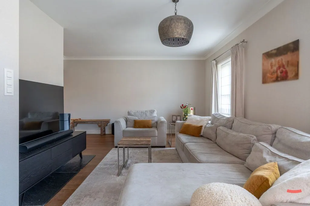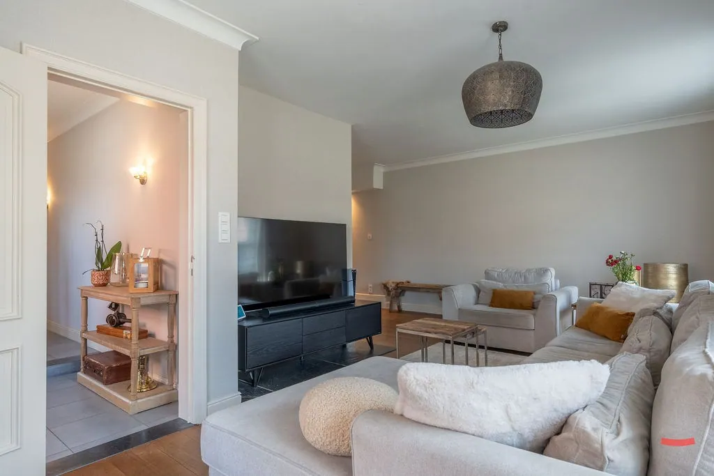 Verder werden beneden alle overbodige muren verwijderd, waardoor de ... woonkamer, eetkamer en keuken naadloos in elkaar overvloeien. Een grote open lay-out, die toch cosy aanvoelt doordat ‘ie in een L-vorm door het huis loopt. De centrale haard zorgt voor extra sfeer, zowel bij woonkamer als de eetkamer. Ook de keuken werd recent vernieuwd, en voorzien van alle nodige snufjes.