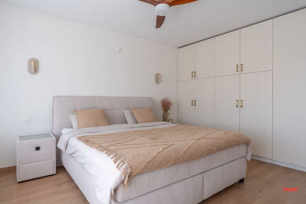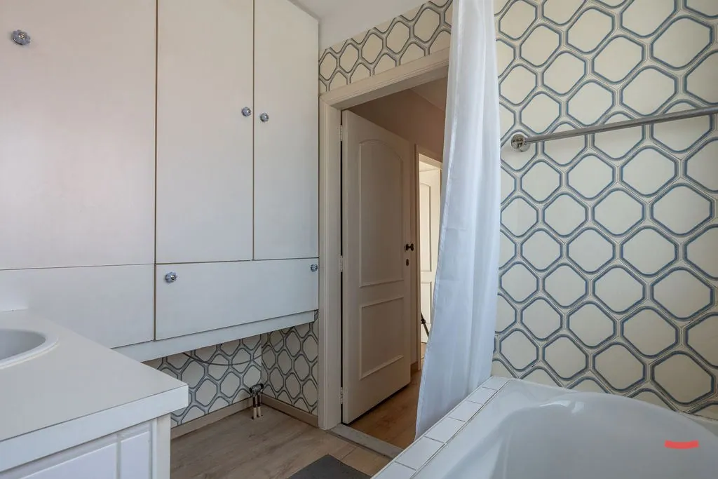 Enkel de badkamer stond nog op de to-do list, dus daar kan je op termijn nog volledig je eigen stempel drukken. Het hoeft niet bovenaan op je prioriteitenlijstje hoor. Deze kan namelijk nog wel een rondje mee, dus neem eerst de tijd om te genieten van je héérlijk overdekt terras in je nieuwe stulpje.