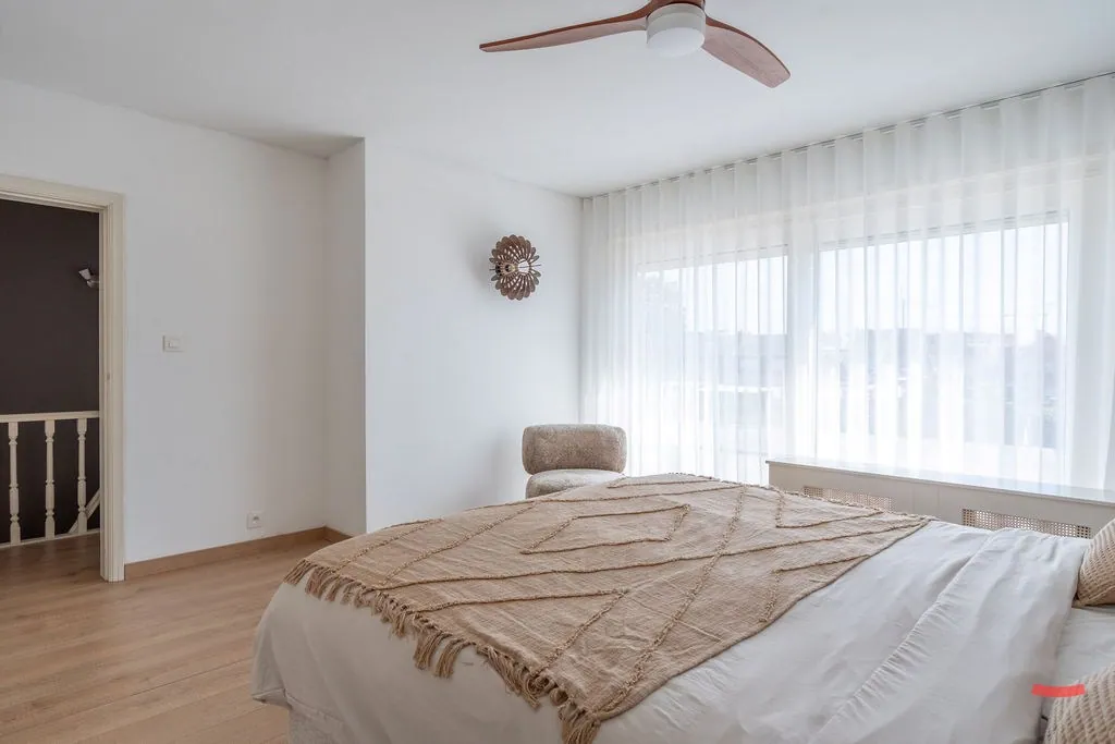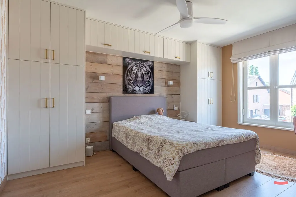 Op de 1ste verdieping zijn 3 grote slaapkamers, telkens voorzien van vaste kasten. Bed erin en klaar! Verder vind je hier ook de badkamer. Geen balzaal, maar alles wat je nodig hebt, zit erin. Op termijn kan ‘ie wat liefde gebruiken, maar je kan het er heus nog een tijdje mee doen. Het toilet is apart.