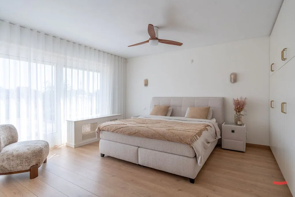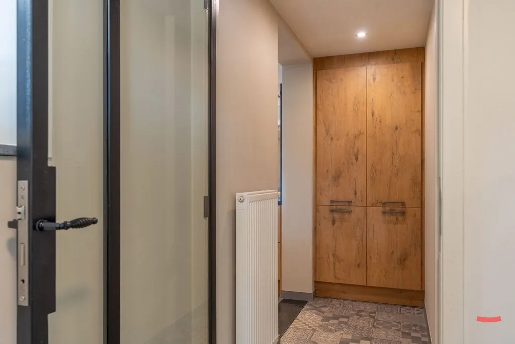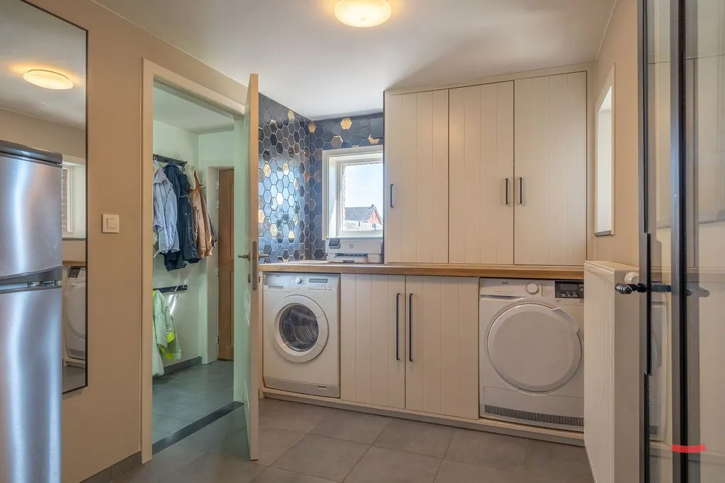 En dan een troef waar elke voetbalmoeder of bmx-vader blij van wordt: een heerlijk grote wasplaats met kastenwand. Brengen die kinderen toch nog iets te veel spullen met zich mee? No worries, aansluitend vinden we de (vorige) garage, die ook volledig werd afgewerkt en ingericht als bergplaats met extra kasten. Ideaal voor het drogen van de voetbaltruitjes van het volledige elftal, het stallen van de BMX en de bakfiets en al het andere hobbymateriaal.