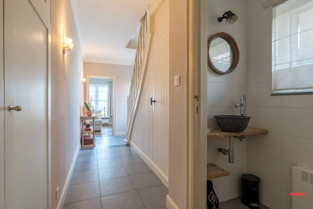 We stappen binnen in een klassieker: een inkomhal als centrale uitvalsbasis naar de woonkamer, keuken, gastentoilet, grote kelder en de trap naar boven. Handig en toegankelijk dus.
