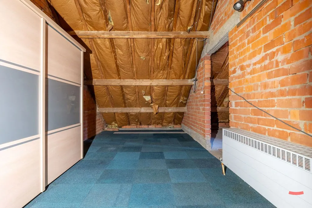De zolderverdieping is niet afgewerkt, maar is een handige opslag. Als je een vaste trap voorziet, kan ‘ie trouwens ook nog ingericht worden als (slaap)kamer, want hij is meer dan voldoende