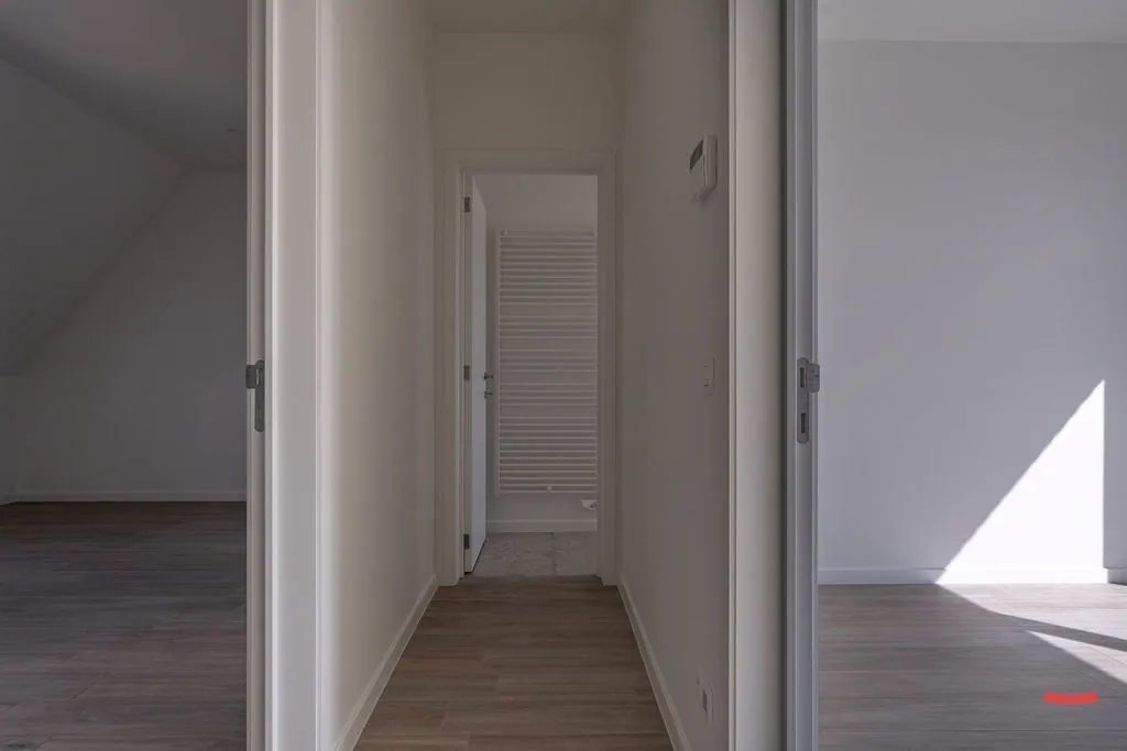 Verder zijn er 3 slaapkamers. De 2 kamers aan de voorzijde zitten onder het schuine dak, maar no worries: dankzij de grote vloeroppervlakte heb je méér dan voldoende ruimte om comfortabel je meubels kwijt te kunnen. De 3de slaapkamer zit aan de achterzijde, en geeft je – via het gigantische schuifraam – ook toegang naar het balkon.