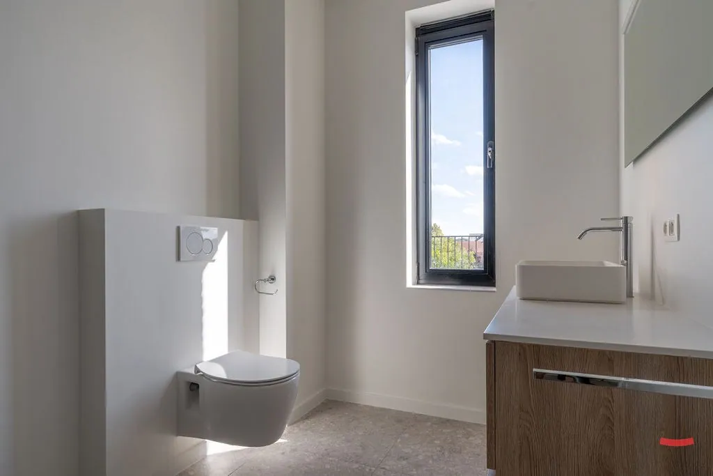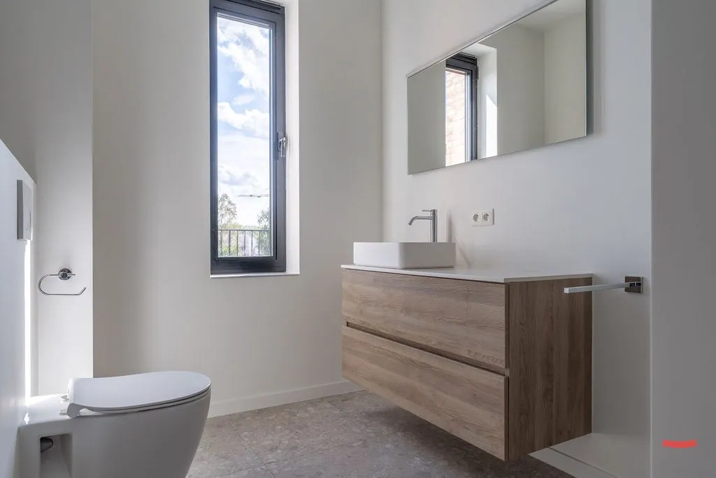 Ook de badkamer is clean en overzichtelijk. Er is een grote inloopdouche, badkamermeubel en een toilet. Er is tenslotte nog een apart gastentoilet.