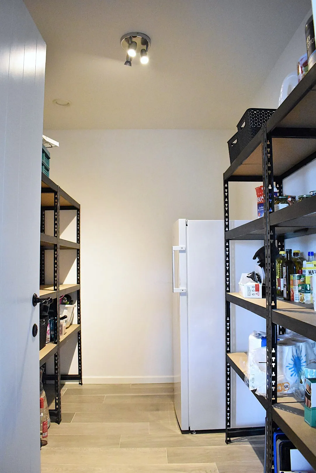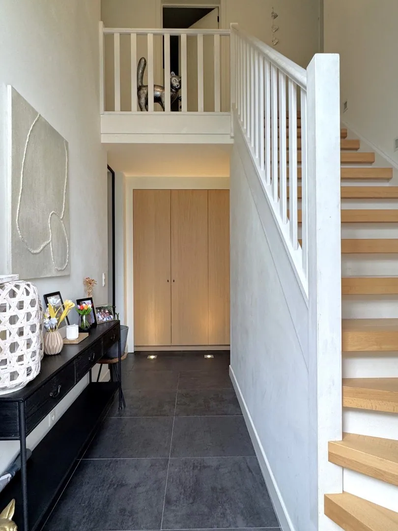 Een toffe binnenkomer, die open inkomhal met handige opbergwand en gastentoilet! Via de stoere stalen deur komen we in de keuken. Zo’n (h)échte gezinskeuken met groot kookeiland staat vaak sowieso op het verlanglijstje, maar deze werd ook nog eens tot in de puntjes voorzien van alle nodige snufjes. Graag nog ... wat extra bergruimte nodig? No probleem, check de grote voorraadruimte naast de keuken. De wandrekken zijn al voor jou voorzien.
