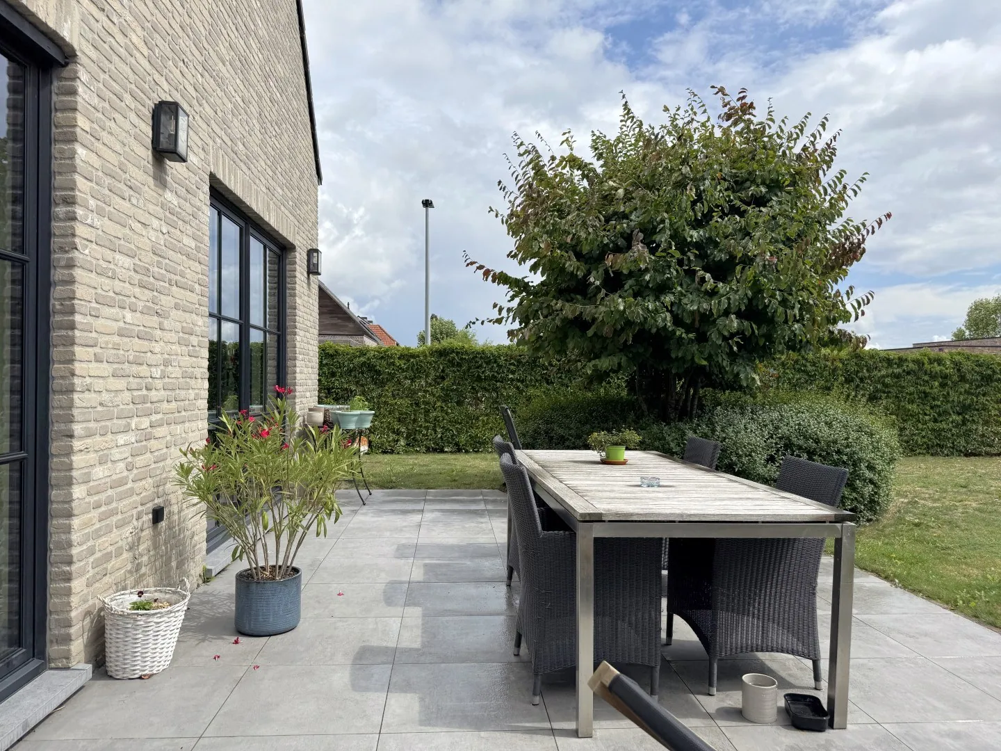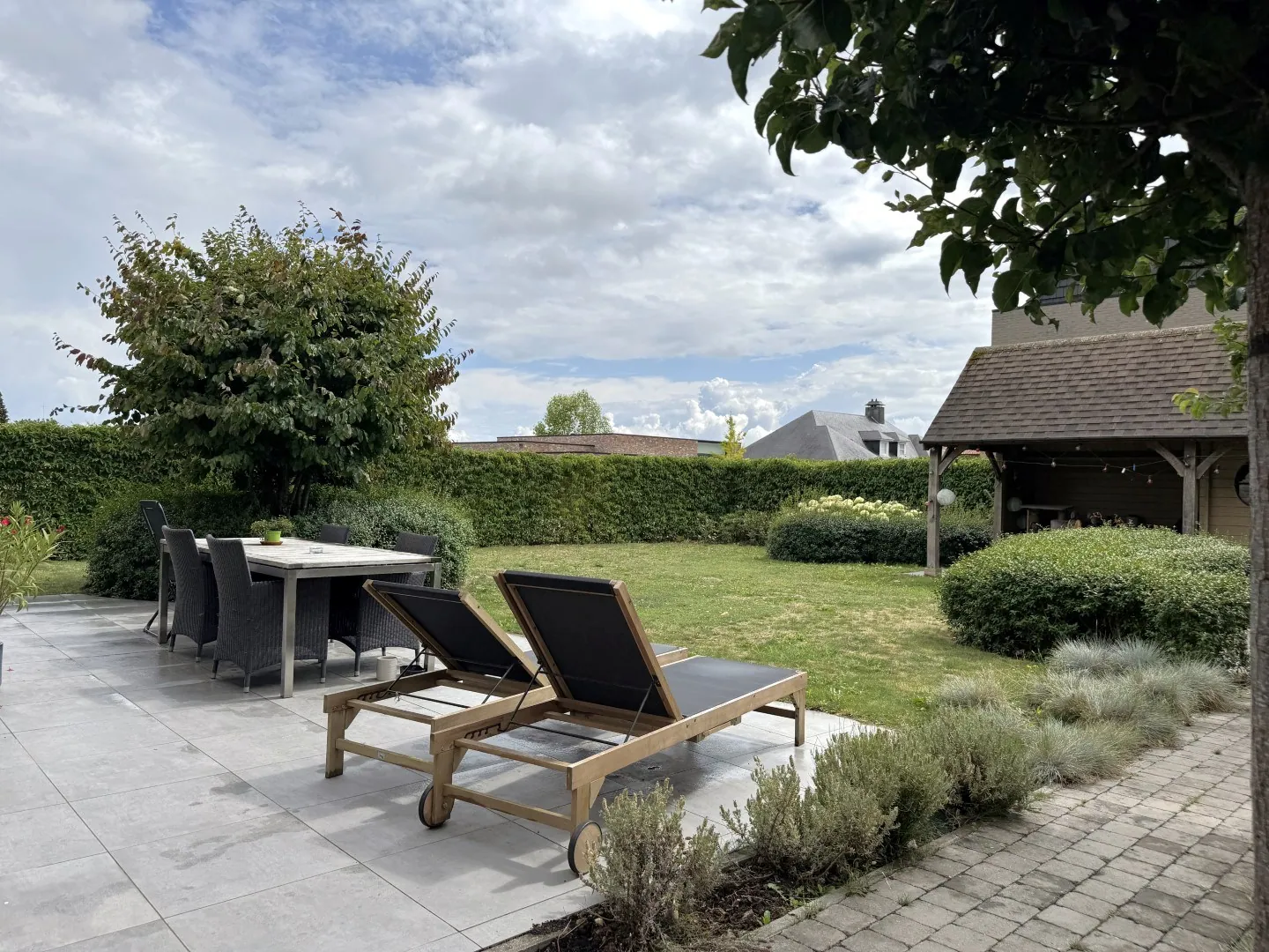 De zuidgerichte tuin werd trendy, maar superonderhoudsvriendelijk ingericht en beschikt over een knap bijgebouw met overdekt terras.