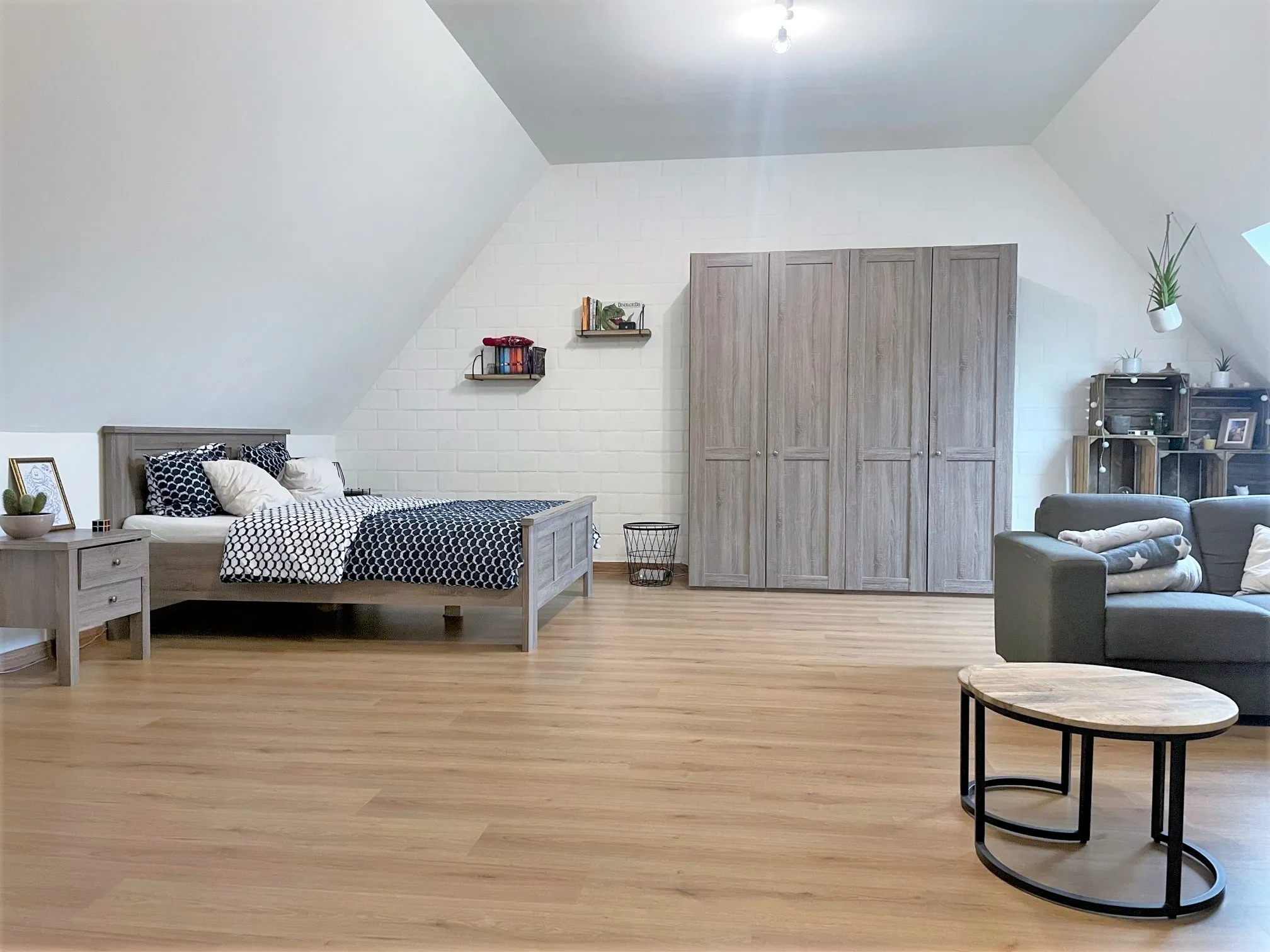 En…we zijn nog niet klaar, want nog een trapje hoger vinden we de volgende voltreffer: de zolder werd namelijk volledig afgewerkt en ingericht als giga slaapkamer. Ideale tienerlounge of speelruimte. Ernaast vinden we nog een extra bergruimte/technische ruimte.