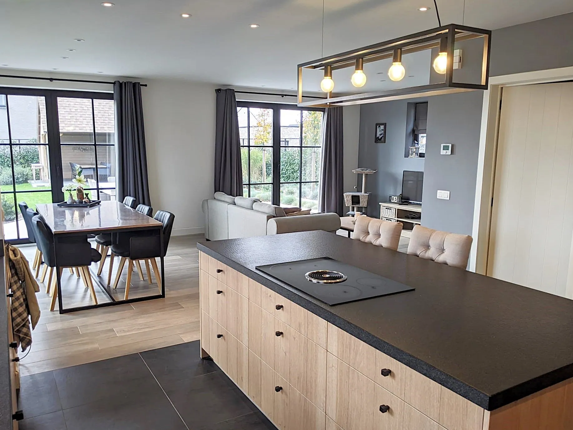 De woonkamer is er eentje waar wij vrolijk van worden: voldoende ruim voor een gezellige bank en een grote tafel, zonder dat ’t meteen een kille balzaal wordt. Had je trouwens dat fijne uitzicht op de tuin in de gaten?
