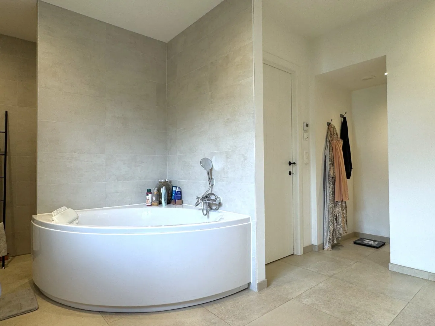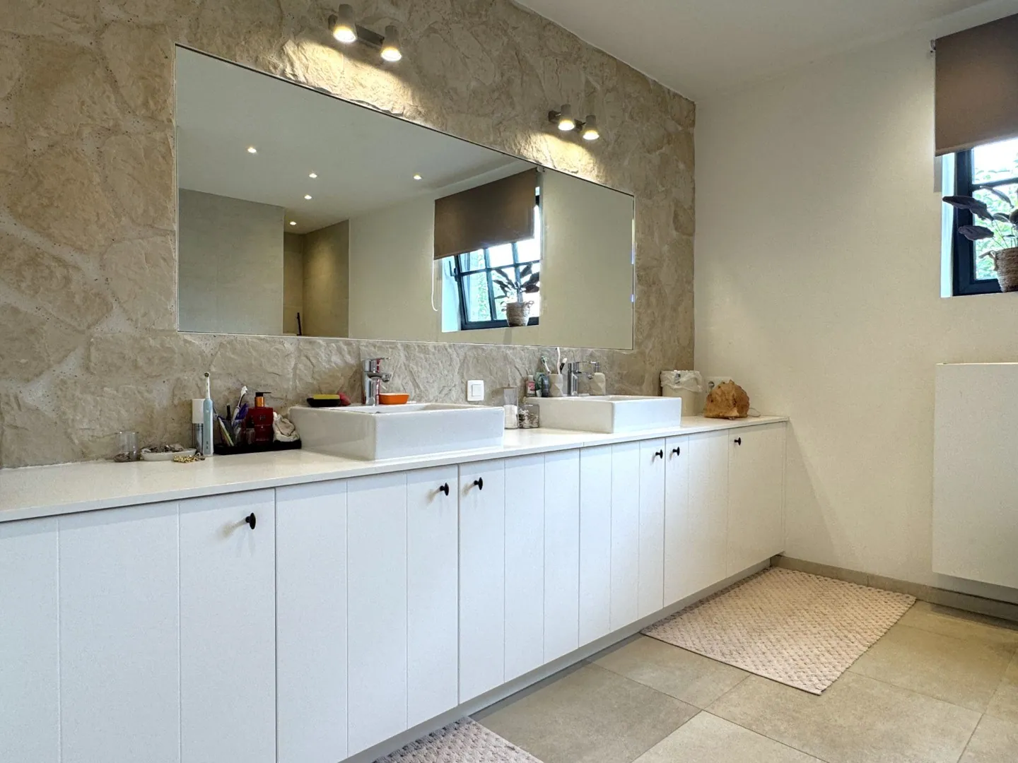 Op de 1ste verdieping zijn 3 slaapkamers aanwezig, waarvan de master bedroom beschikt over 2 grote kastenwanden. Ook de badkamer is een balzaal, met een groot bad, inloopdouche, dubbel wasmeubel en een toilet. Tenslotte vinden we op deze verdieping nog een wasplaats met – jawel, je raadt het al – ook weer vaste kasten.