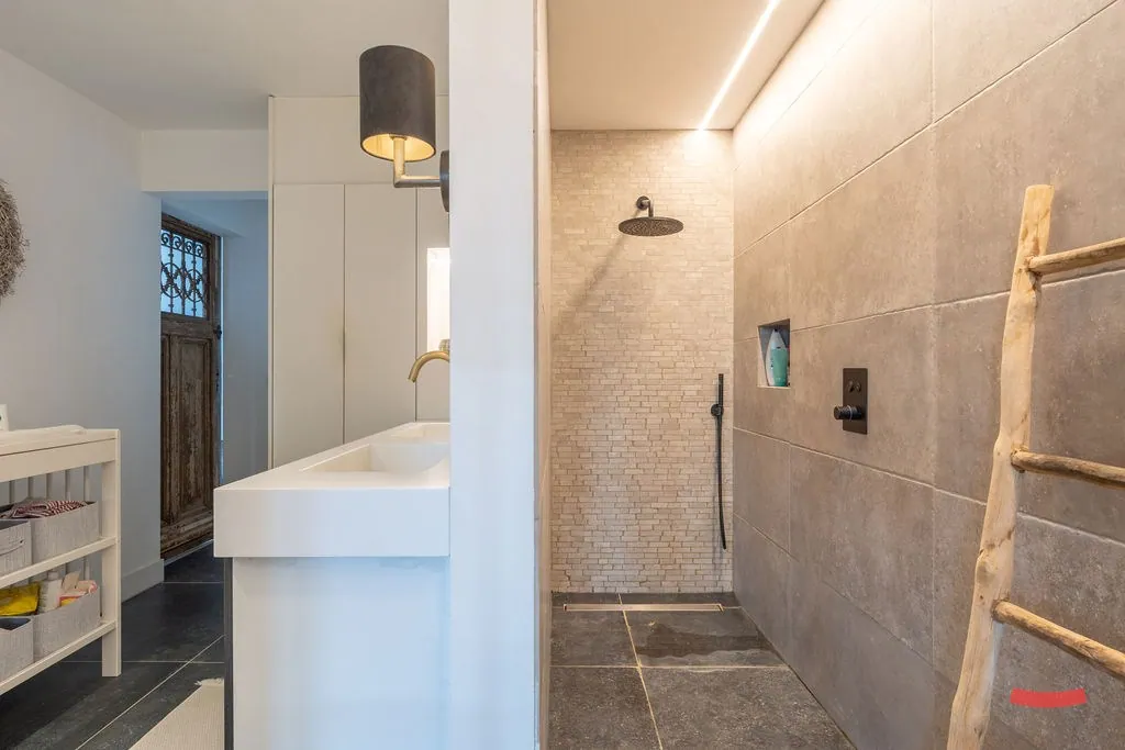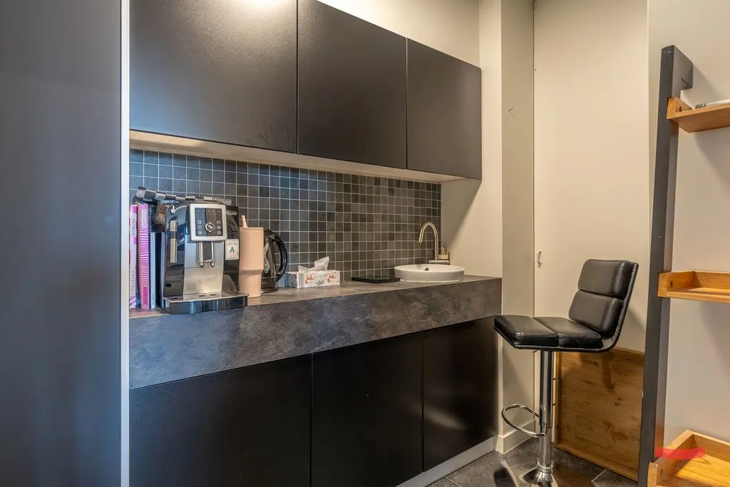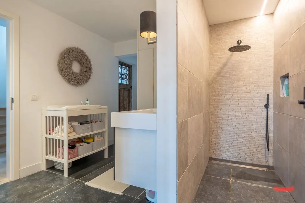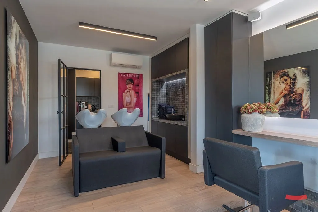 Nog even over het handelsgedeelte. Jep, de eigentijdse sfeer komt hier ook helemaal tot z’n recht, dus hier kan je je ding doen in stijl. Momenteel is ’t een erg goeddraaiend kapsalon, maar ook ideaal als boetiek of kantoor. Je hebt een rechtstreekse verbinding via de woning, maar alles kan ook apart gebruikt worden. Er is namelijk een eigen ingang met parkeergelegenheid voor de deur.