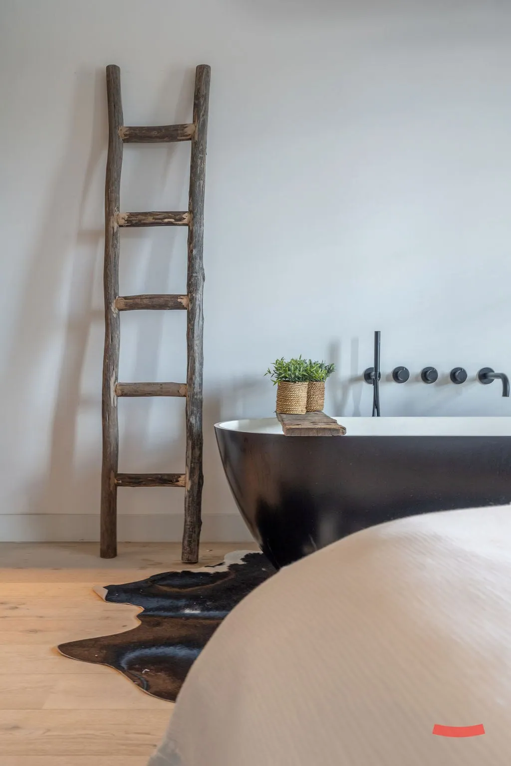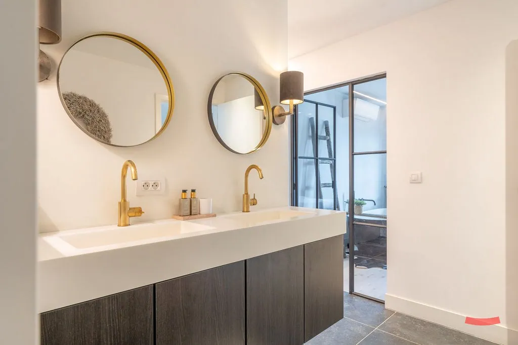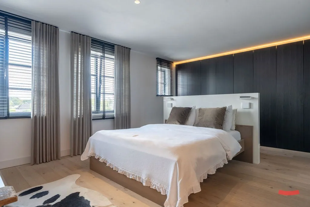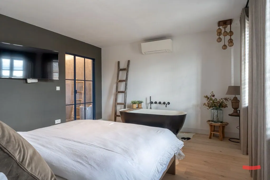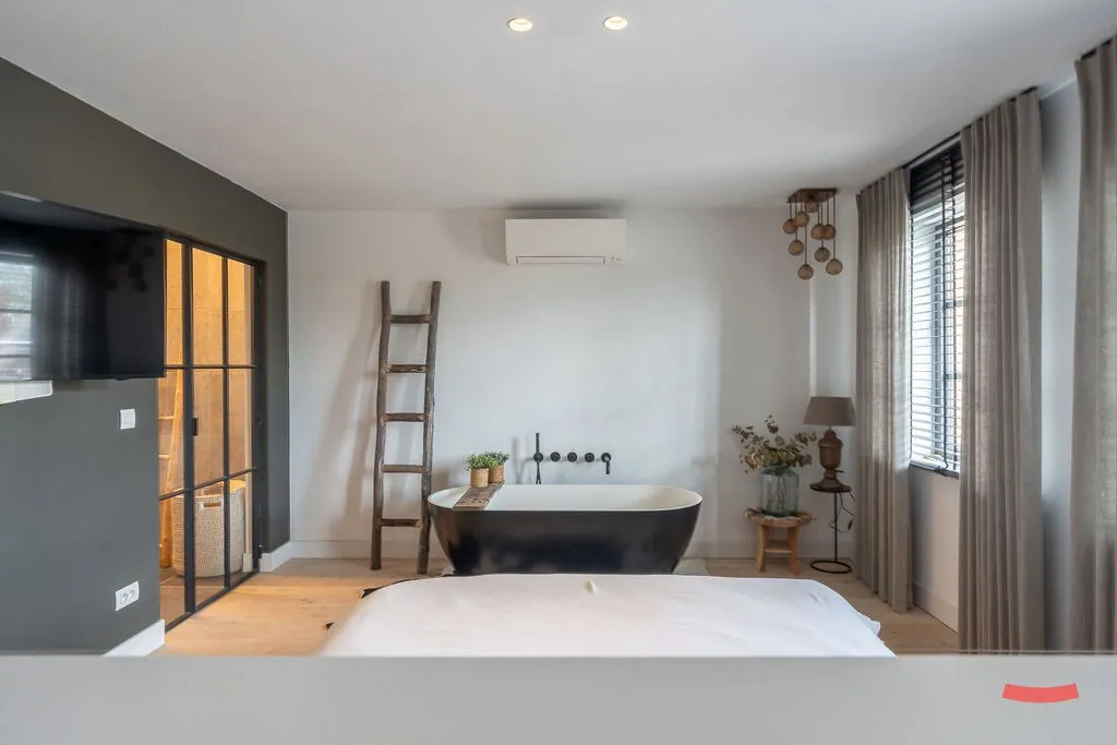 Verder vinden we op de eerste verdieping de master bedroom, en die zouden hippe makelaars omschrijven als “hotel-chic”, want dat klinkt trendy. Maar het is in dit geval écht zo, want je beschikt over een erg grote slaapkamer met kastenwand, airco, een vrijstaand bad – yes yes, very hip – en een ensuite badkamer. Die laatste is trouwens ook bereikbaar via de hal, dus je nageslacht hoeft niet op zondagochtend door je slaapkamer wanneer ze een douche willen nemen. Een handig weetje. Knipoog, knipoog.