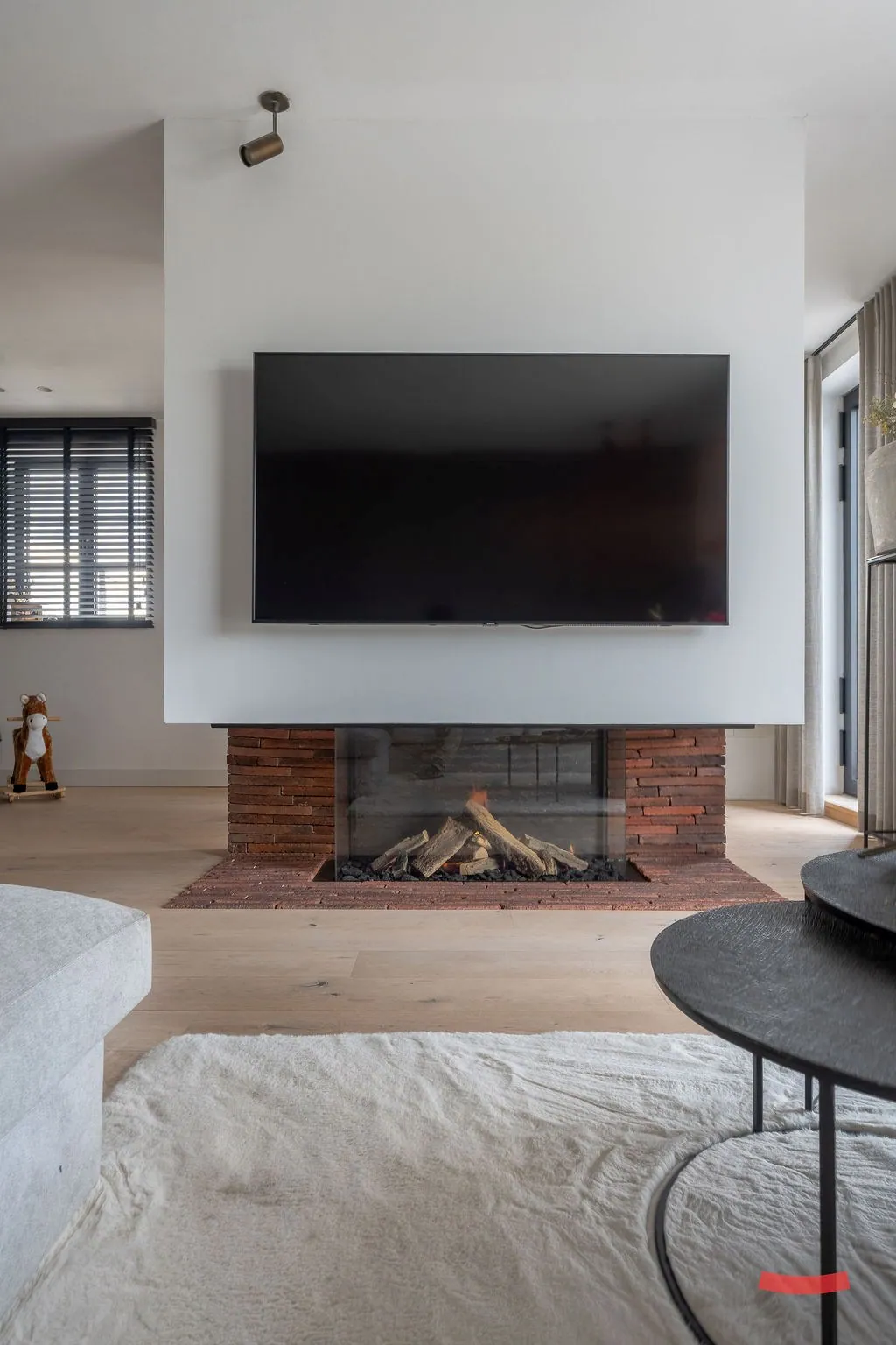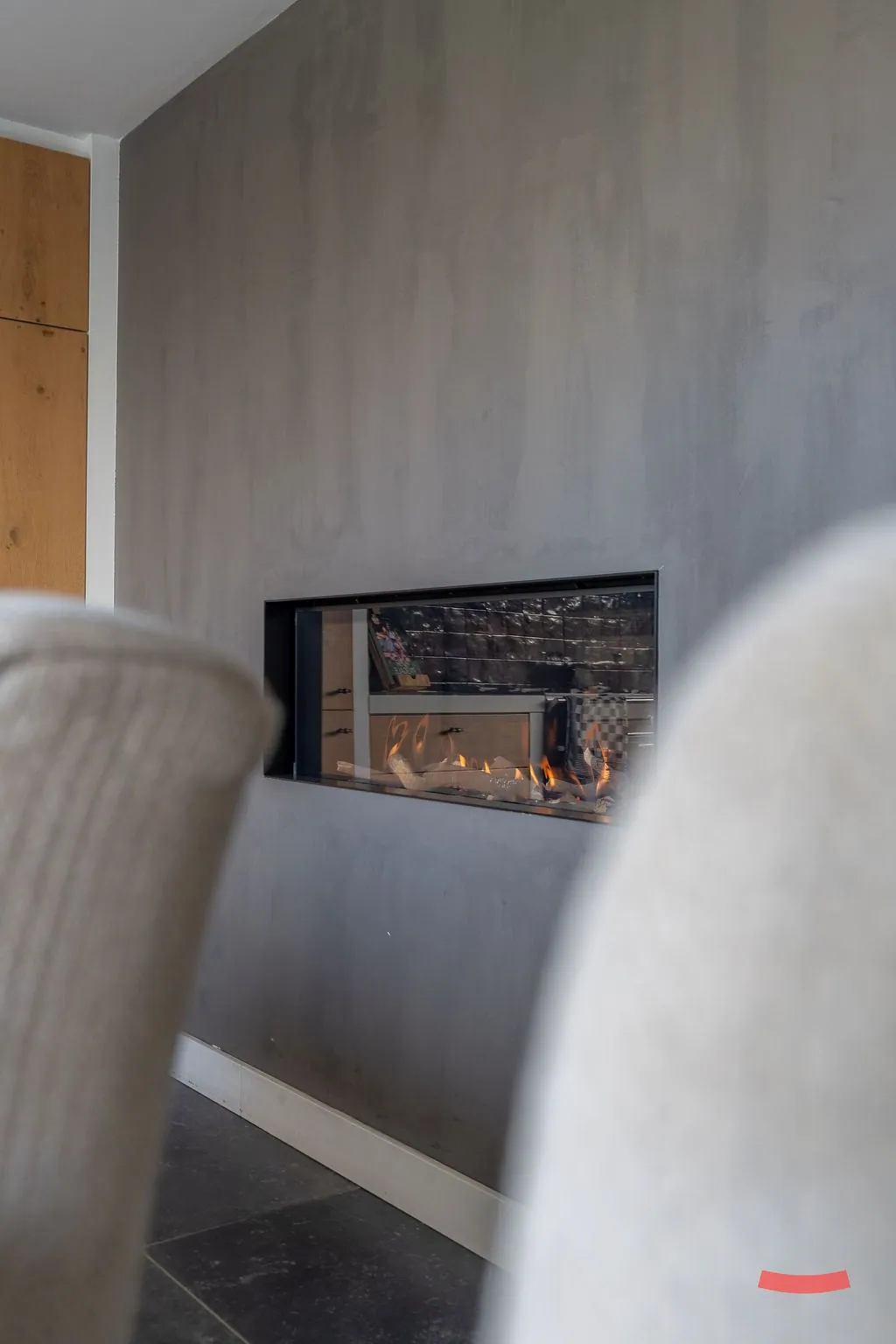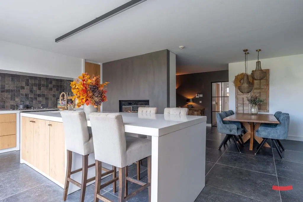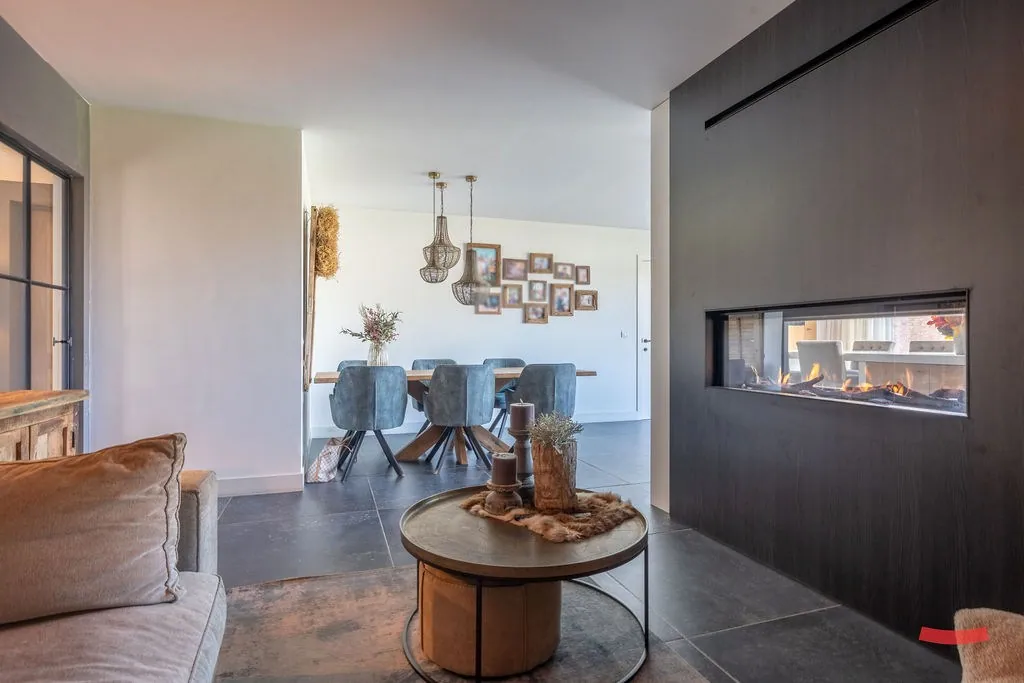 Zullen we eerst beginnen bij het privé-gedeelte? Die voordeur zit aan de zijgevel, waarna je een cosy inkomhal binnenstapt. Deze geeft toegang naar een gastentoilet, een grote bijkeuken/wasplaats – check de handige kastenwand – en de woonkeuken. En de nadruk ligt hier op “woon”, want het is er echt gezellig vertoeven. Niet enkel zijn alle snufjes aanwezig, maar ook de materialen stralen warmte en sfeer uit. Letterlijk zelfs, want wie kan zeggen dat ‘ie kan koken met een knisperend haarvuur op de achtergrond? Verder is er plaats voor een grote tafel, en werd hier een fijne lounge/tv corner voorzien.