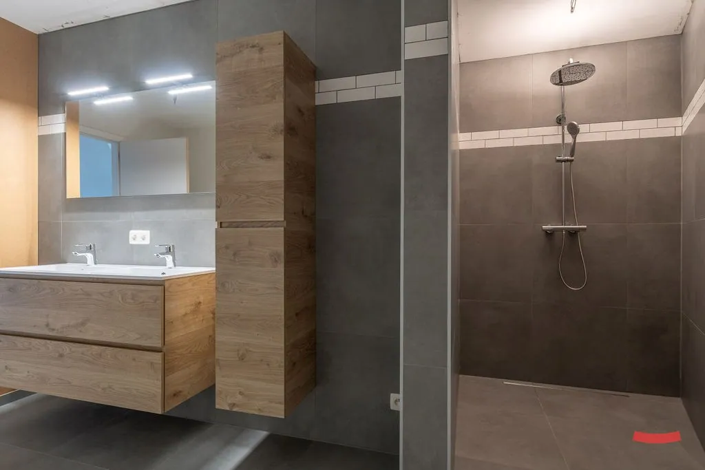 Op de 1ste verdieping zien we 3 grote slaapkamers, en een badkamer waar je ’s morgens al eens een dansje kan doen. We zien een dubbele wastafel, bad en grote douche.