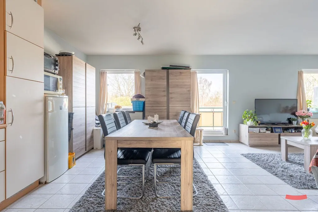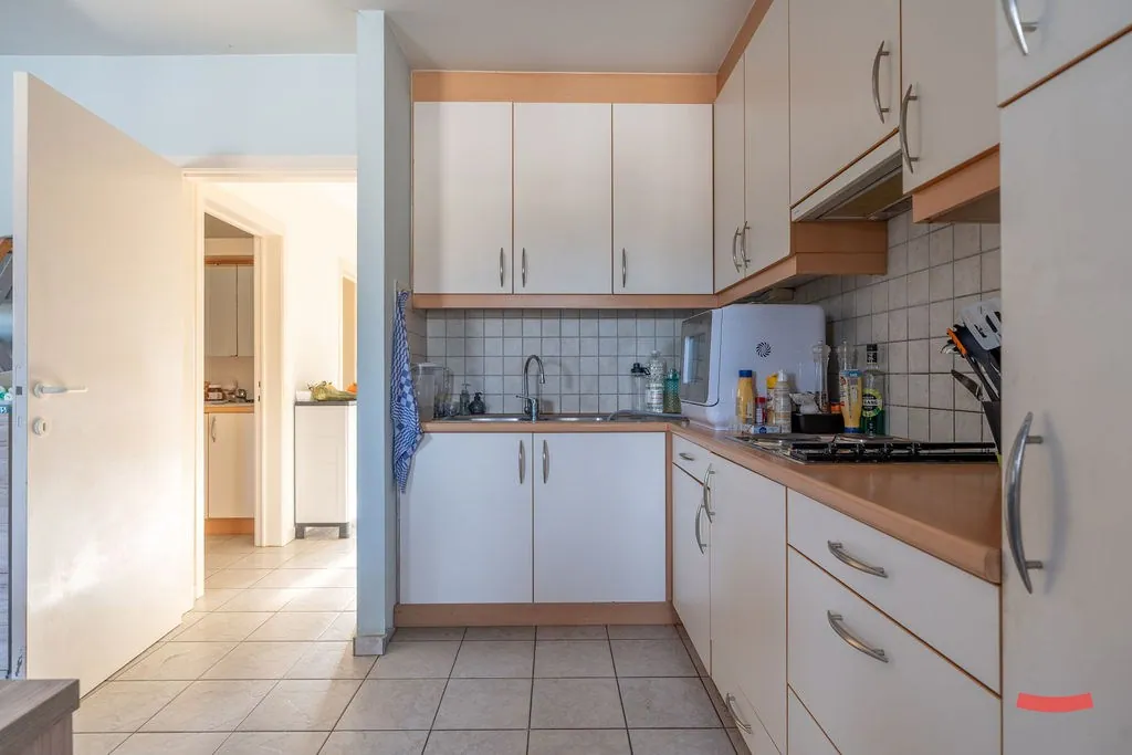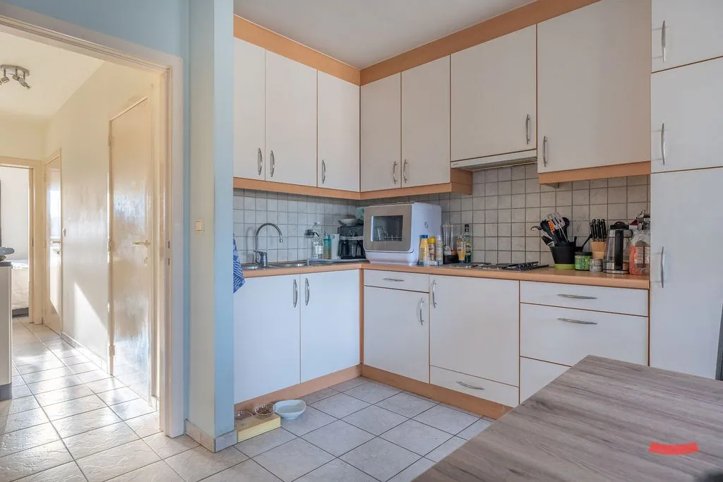 De lift stopt voor de deur, en zo stap je meteen de inkomhal in. Zullen we aan de achterkant beginnen? Daar is namelijk de woonkamer met open keuken, en da’s een prima ruimte. Doordat de keuken in de hoek staat, heb je meer dan voldoende plaats voor je grote bank en een gezellige tafel. De keuken is basic, maar netjes en kan dus zeker nog een rondje mee. Heb je trouwens ook het grote balkon gespot dat aan je woonkamer grenst?