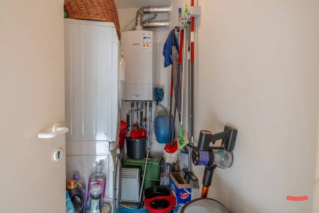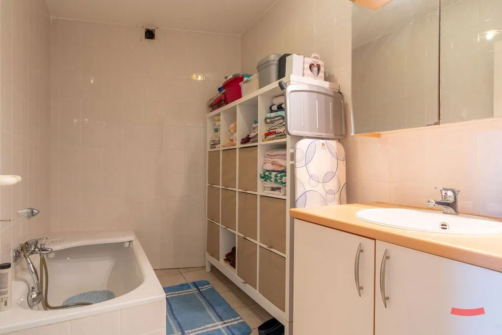 Verder is er een badkamer, met bad en een wastafel. Liever een douche, zeg je? No problemo, als je het bad eruit haalt, heb je méér dan voldoende ruimte voor een grote inloupdouche. Het toilet is apart. Tenslotte is er nog een compacte, maar handige berging met aansluitingen voor wassen en drogen.