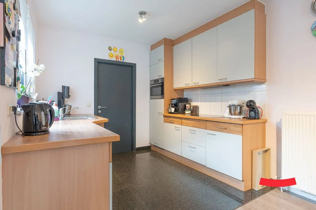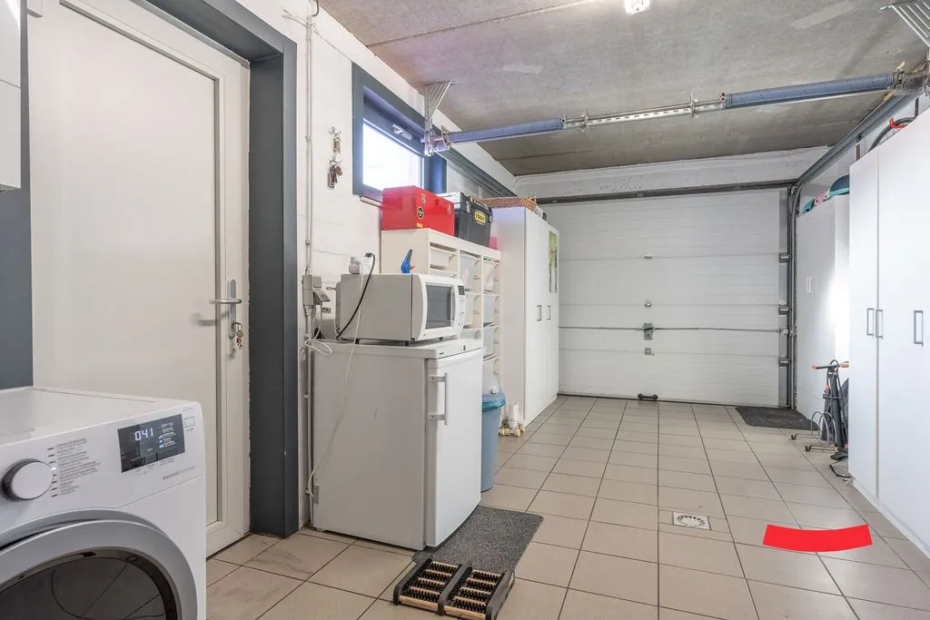 Via de inkomhal (met gastentoilet) komen we in de woonkamer. Geen overbodige hoekjes en kantjes, maar een open, luchtige lay-out met aansluitend de open keuken. Deze is voorzien van alle snufjes, en kan zeker nog een rondje mee. Naast de keuken vinden we de garage/berging met aansluitingen voor wassen en drogen. De veranda zorgt voor extra licht en lucht, en is écht een hele toffe ruimte om je ding mee te doen: ... eetkamer, hobbyruimte, zithoek, speelkamer, etc. Check!