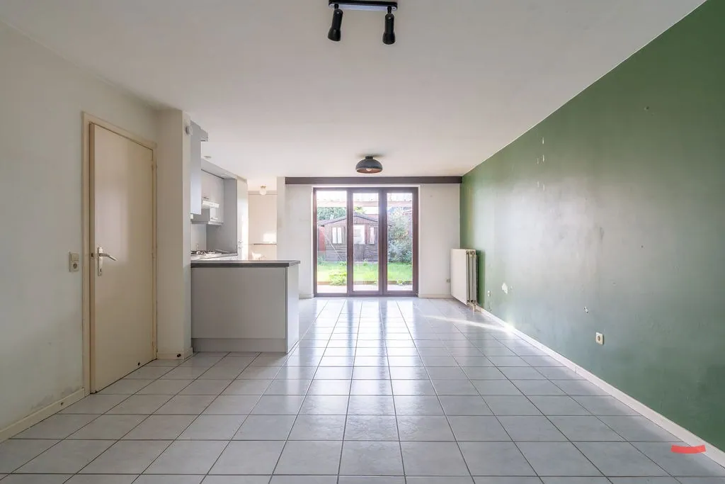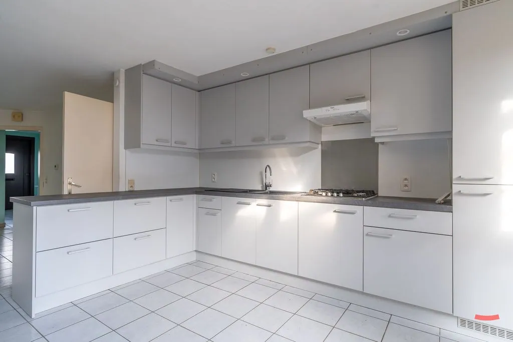 We ... stappen binnen via de inkomhal – met gastentoilet en voldoende plaats voor een fiets – en wandelen meteen de woonkamer in. Geen gedoe met aparte kamertjes, maar een open lay-out met living en keuken. De lichtinval wordt zo optimaal benut, en je zit niet met vervelende hoekjes en kantjes. De keuken is basic, maar netjes en kan zeker nog een rondje mee. En hij is verrassend groot, toch? Om het hoekje zien we nog een plekje voor de wasmachine.