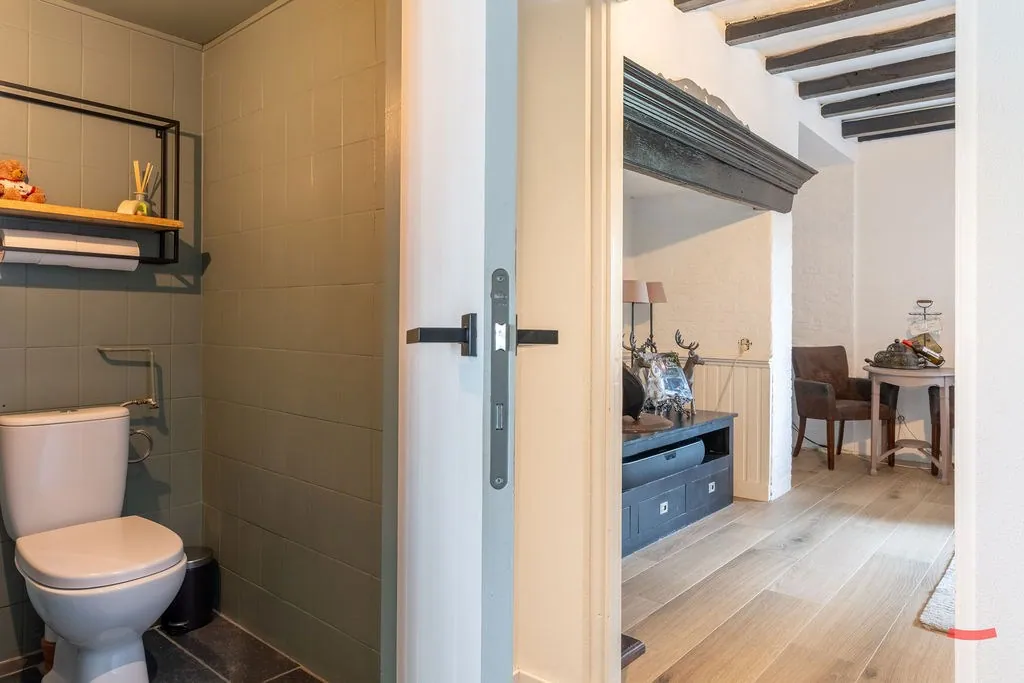 We starten in de inkomhal, als hart van het huis. Dit is namelijk je centrale uitvalsbasis en geeft je toegang naar 2 grote, gelijkvloerse slaapkamers (waarvan eentje werd ingericht als 2de woonkamer), de badkamer, kastenwand met aansluiting voor wassen en drogen, een apart toilet en de grote leefruimte. Deze laatste werd helemaal opengegooid, en omgevormd naar een grote, open lay-out waar wonen, koken en eten samenkomen. Uiteraarrrrd zonder de charmante touch te verliezen. De keuken werd volledig op maat gemaakt, en is een perfecte match met het authentieke karakter van de woning. Ernaast is nog een handige bergplaats/bijkeuken.